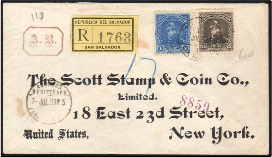 > Einschreibebrief mit Rückschein von San Salvador nach New York, an 20. Juli 1893. Die Gebühr von 26 Centavos setzt sich zusammen aus 11 Centavos für die 1. Gewichtsstufe bis 15 gr., 10 Centavos für die Einschreibgebühr und 5 Centavos für den Rückschein.