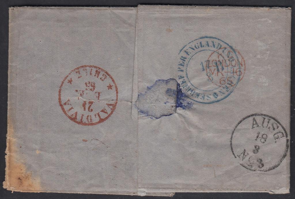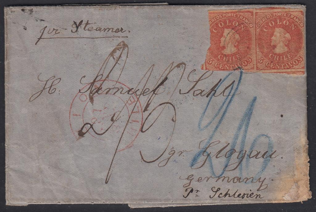 > Frankierte Auslandsbriefe der klassischen Markenzeit Chiles sind immer recht selten. Nach Frankreich sind sie noch zu finden; in andere Länder indes sind solche Belege außerordentlich selten. Hier ein Brief aus Union im Süden Chiles in der Gewichtsstufe eine halbe Unze. Der Absender berichtet darin über sein Leben in der neuen Heimat Chile. Der Brief war an einen alten Freund nach Glogau in Schlesien, also nach Preußen adressiert. Er wurde am 21. Januar 1865 aufgegeben und zeigt rückseitig den Durchgangsstempel von Valdivia, den Transitstempel von London, den Schiffspoststempel der Niederlande und schließlich den preußischen Postausgabestempel von Glogau vom 18. März 1865. Vorderseitig sind die Taxvermerke von - vermutlich - Großbritannien und Preußen vermerkt. Ich wäre für Hinweise dankbar, wie diese zu erklären sind. Meines Wissens ist dieser Brief der bisher einzig bekannte mit Destination Preußen, der mit klassischen Ausgaben Chiles frankiert wurde.