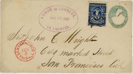 > 5 Centavos Umschlag aus weißem Papier im Format 160 x 89 mm. Die Auflage betrug 70.000 Stück. Der Umschlag zeigt eine für El Salvador typische Vulkanlandschaft, die Cerros Quemados im Ilopango See nahe San Salvador und im Hintergrund den Vulkan Chichontepec (San Vicente). 15.5.1889: Von La Libertad nach San Francisco (2.6.1889) war eine Zusatzfrankatur von 5 C. für Briefe der 1. Gewichtsstufe zum UPU Tarif notwendig. Der rote “PAID ALL“ - Stempel von San Francisco bestätigt die korrekte Frankierung. Der große Oval-Stempel „ADMON de CORREOS (Postverwaltung) LA LIBERTAD“ wurde wie zu der Zeit üblich auf dem Umschlag abgeschlagen ohne den Wertstempel zu treffen. Nur die Marke wurde mit einem stummen Stempel (hier ein Stern) entwertet.