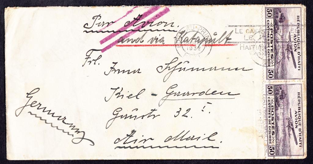 > In den Dreißigerjahren waren Direktflüge über den Atlantik noch selten; man behalf sich mit Katapulteinrichtungen auf den schnellen Ozeandampfern, um Post von und nach Europa noch schneller ans Ziel zu bringen. Recht oft trifft man solche Briefe mit der Destination USA oder solche von dort an. Hier ist einmal ein Exemplar, das von Haiti aus 1932 nach Deutschland befördert wurde. Auch der Briefinhalt ist noch erhalten - und gibt Einblicke in das Leben damals auf der Karibikinsel.