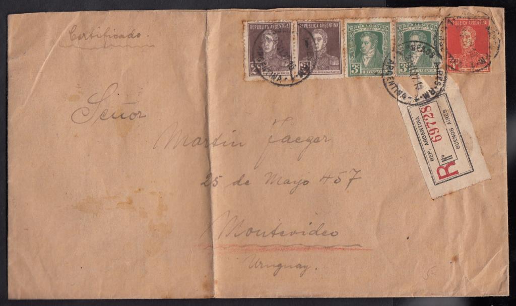 > Eingeschriebene Briefe aus Lateinamerika sind gerade im 20. Jahrhundert recht häufig, da sie die Möglichkeit des registrierten und damit sicheren Versands boten. Hier hat der Absender die Post etwas überlistet: Frankiert wurde der Brief von Argentinien nach nach Uruguay 1927 u. a. mit einem Ganzsachenausschnitt zu 5 Centavos - und dies war eigentlich nicht legal. Solche Belege im Bedarf mit Ausschnitten aus Ganzsachen sind gerade aus Südamerika schwer zu finden.