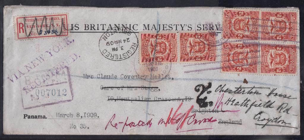> Dienstpost sieht heute oft sehr langweilig aus - früher war das noch anders. Da galt es, durch eindrucksvolle Aufmachung Gravität zu zeigen. Auch dieser Dienstbrief aus Panama strahlt Würde aus: Er wurde 1909 von der britischen Botschaft in Panama verschickt und musste von Brighton aus nach Croyden nachgesandt werden. Dafür wurden 2,5 Shilling nachberechnet. Da der Brief über die USA lief, wurde er noch mit einem R-Zettel des Auswechselpostamtes New York gekennzeichnet.