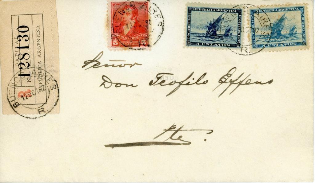 Um den Tarif von 12 Centavos für einen Ortseinschreibebrief abzudecken musste beim abgebildeten Beleg eine 5 Centavos Marke, hier Michel Nr. 87 vom 10.9.1892 hinzu geklebt werden, da von den Sondermarken nur je eine Marke pro Person abgegeben wurde. Diese Freimarke zeigt das Abbild von Bernardino de la Trinidad González Rivadavia y Rivadavia, dem 1. Präsidenten der Vereinigten Provinzen des Río de la Plata, des heutigen Argentiniens. Die 12 Centavos Gebühr für Ortseinschreiben war kaum bekannt, von der Post erst im Oktober 1892 im größeren Umfang publiziert und nur 1892 gültig.