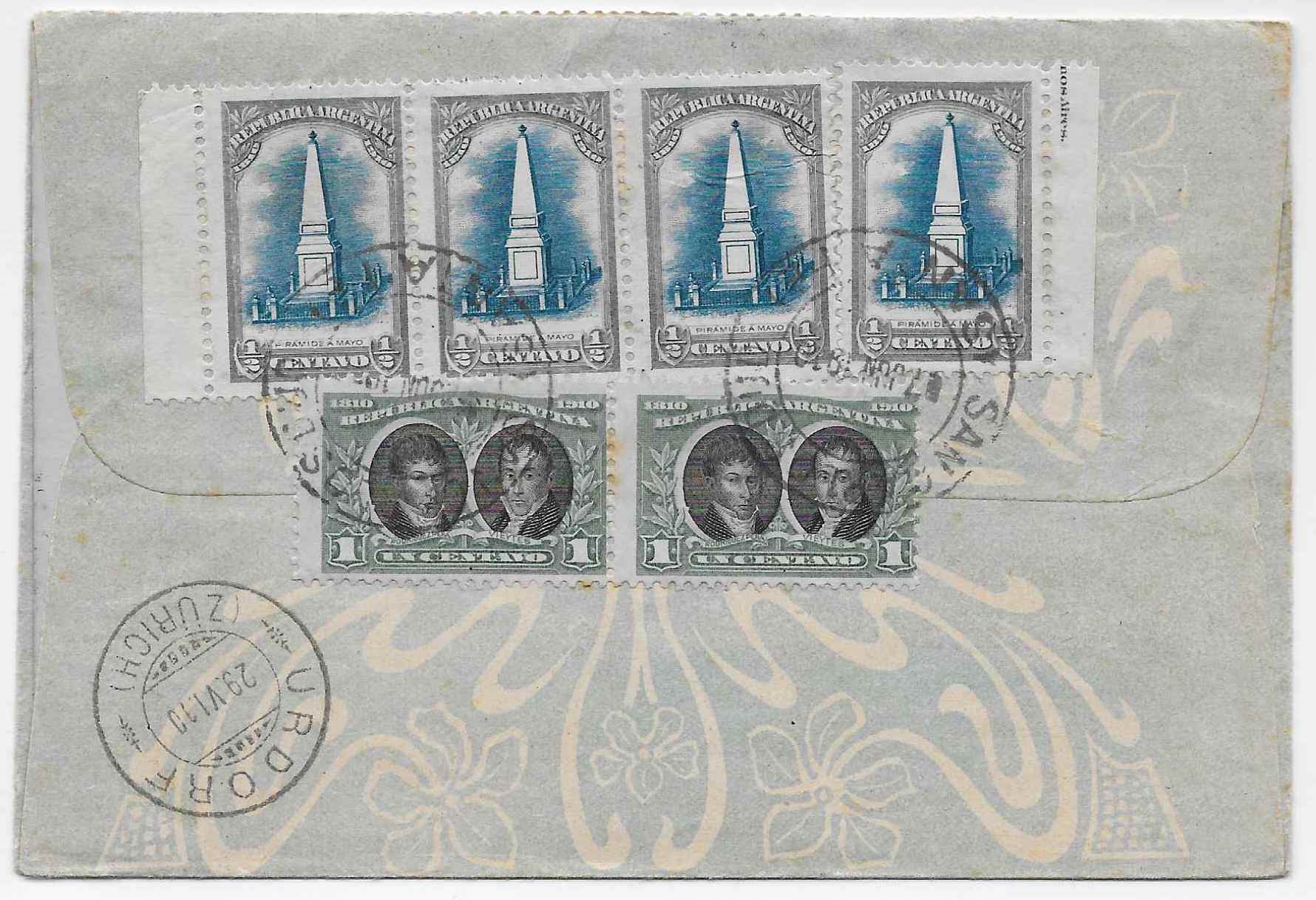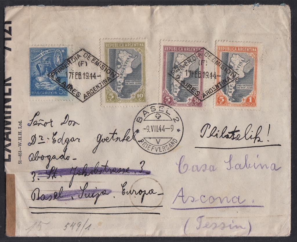 Der oben gezeigte Brief ist ein echt gelaufener Ersttagsbrief mit drei Werten des Satzes - der Höchstwert war dem Absender sicher zu teuer - in ein anderes Katastrophengebiet - das vom Zweiten Weltkrieg gezeichnete Europa. Er wurde am 17. Februar 1944 in Buenos Aires abgeschickt, durchlief die britische Zensur in der Karibik und später die deutsche Zensurstelle in Paris. Erst am 9. Juli war der Brief in Basel und wurde dann nach Ascona weitergeleitet - ein mediterranes Paradies in der Düsternis jener Zeit.