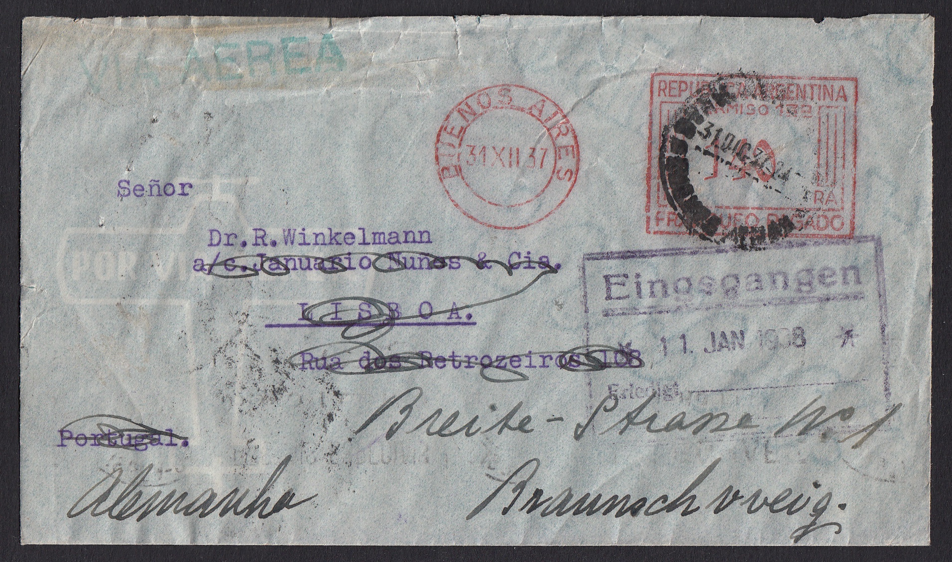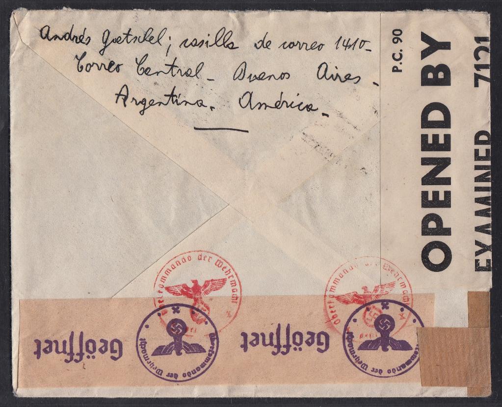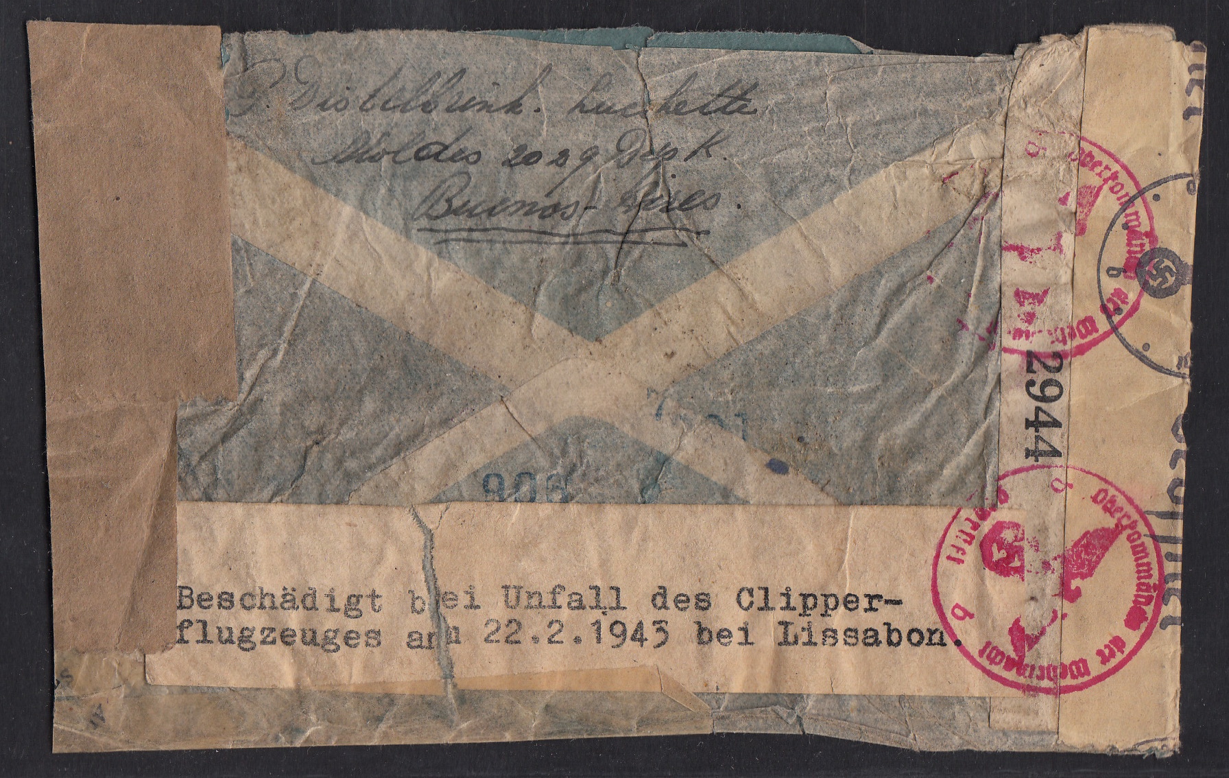 Im Februar startete in Buenos Aires, der Hauptstadt Argentiniens, ein Flugzeug Richtung USA. Mit an Bord: Post für Europa. Dieser Brief war mit an Bord. Er wurde in den USA zensiert und weiter mit einem US-Flugzeug über den Atlantik befördert. Beim Anflug auf Lissabon kam es zur Katastrophe: Die Maschine stürzte am 22. Februar 1943 ab. Die Hintergründe sind unklar. Der Brief mit Bestimmungsort Amsterdam in den Niederlanden überstand den Absturz. Er wurde nach Deutschland transportiert, versiegelt und in Berlin zensiert. Ein histrisches Stück aus der düsteren Zeit des Zweiten Weltkrieges.
