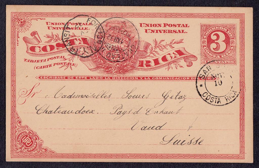 > Ganzsachen der heutigen Zeit für das allgemeine Publikum sind oft recht schmucklos. Früher war das anders; auf ihre Optik wurde sehr großen Wert gelegt. Oben ein Beispiel aus Costa Rica. Die Auslandskarte mit schöner künstlerischer Verziehrung lief 1892 aus der Hauptstadt San Jose nach Vaud in der Schweiz. Sie wurde am 10 November abgeschickt und traf am Empfangsort bereits am 1. Dezember ein - ein Tempo, das heute mitunter nicht mehr erreicht wird.