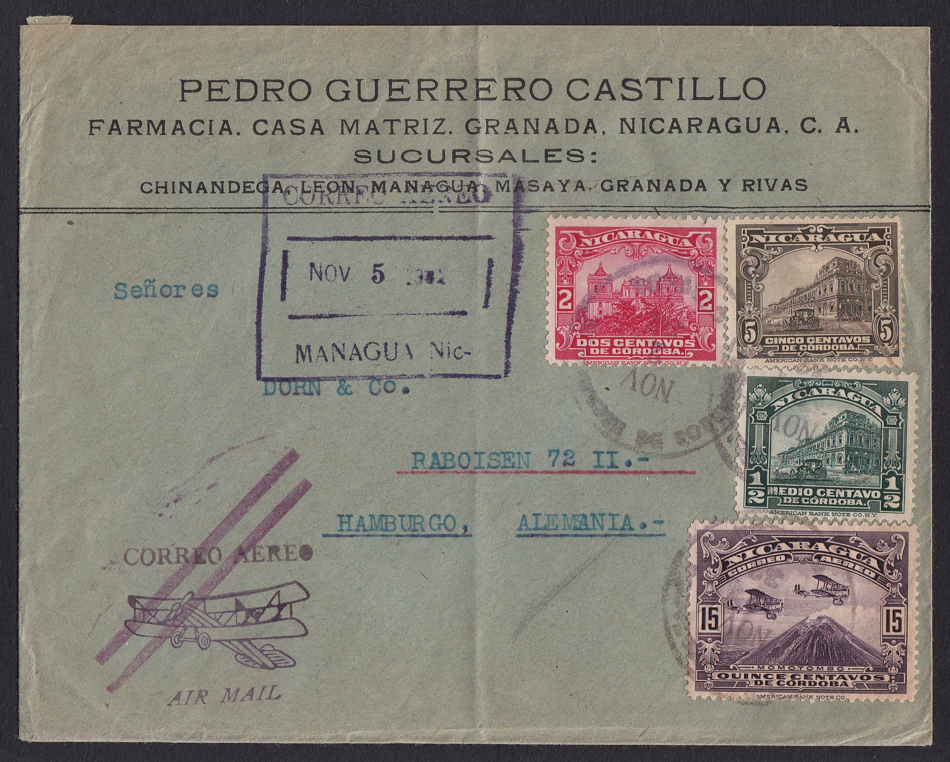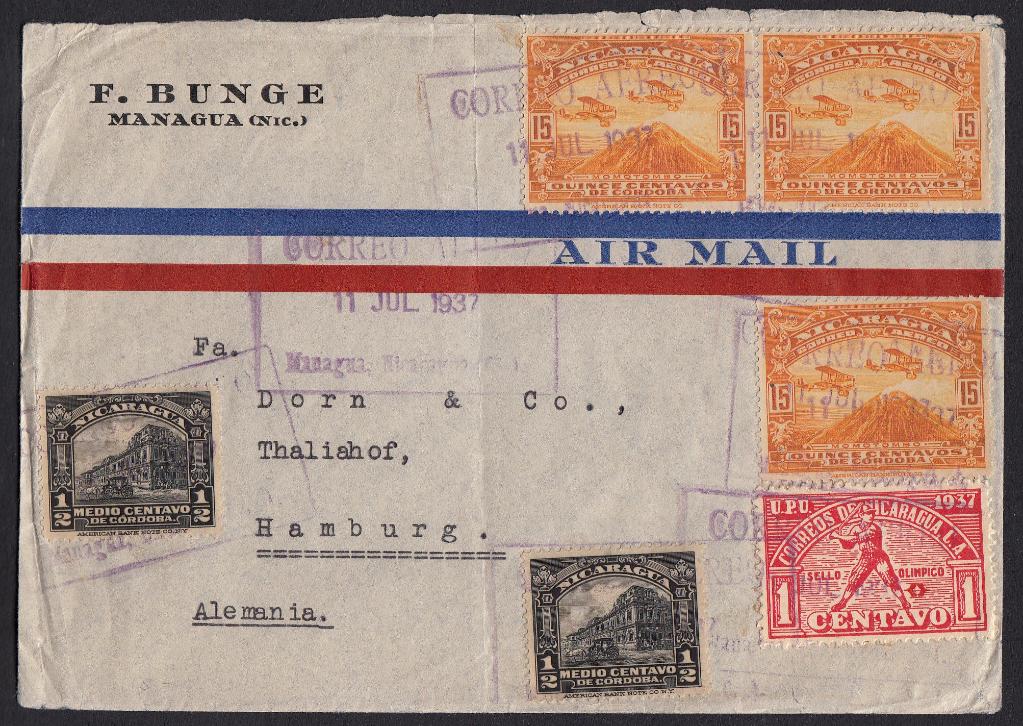 > Langstreckenflüge sind heute nichts mehr außergewöhnliches. Ein Shoppingwochenende in New York ist selbst für Normalverdiener erschwinglich und nicht einmal exotisch. Anfang der 1930er-Jahre sah das noch anders aus. Die Beförderung dieses Luftpostbriefes hier vom 5. November 1932 aus der nicaraguanischen Hauptstadt Managua war sicherlich ein fliegerisches Wagnis. Der Brief flog von Nicaragua Richtung USA, sicher über Texas, und dann bis New York. Von dort ging es rund 6000 Kilometer über den Atlantik bis Großbritannien und dann auf der letzten Etappe bis Hamburg. Zur Erinnerung: Die erste Überquerung des Atlantiks Non-stop von Charles Lindberg fand erst 1927 statt. Das Flugzeug, das diesen Brief beförderte, wird aber sicher anders ausgesehen haben, als der Luftpost-Cachetstempel und das Motiv der 15-Centavos-Marke vermuten lassen.
