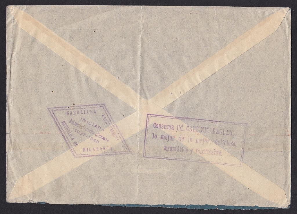 > Werbung ist in unserer Zeit oft nicht gern gesehen; sie verstopft unsere Briefkästen. Nicaragua verband früher beides - den gewöhnlichen Brief und die Werbung. Zu sehen ist ein dekorativ frankierter Luftpostbrief vom 11. Juli 1937 aus der Hauptstadt Managua nach Deutschland. Rückseitig findet sich ein rechteckiger Werbestempel für nicaraguanischen Kaffee - geschmacklich gut, aromatisch und belebend, wie der Text hervorhebt. Vermutlich wurde der Stempel von der Post angebracht. Auch andere kaffeeexportierende Länder hatten ähnliche Werbestempel. Kaffee war in Europa damals recht teuer, da lohnte der Aufwand. Kaffee aus Nicaraugua, gibt es den heute überhaupt noch?