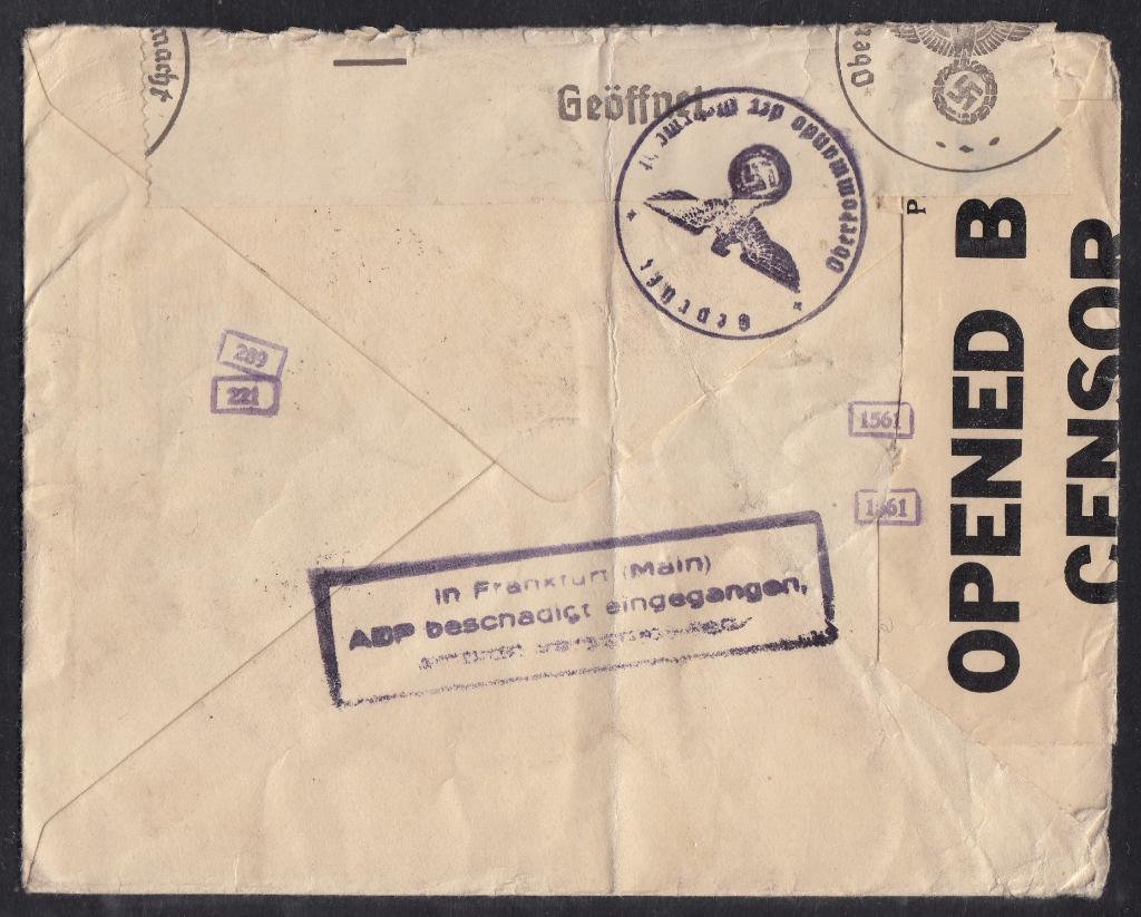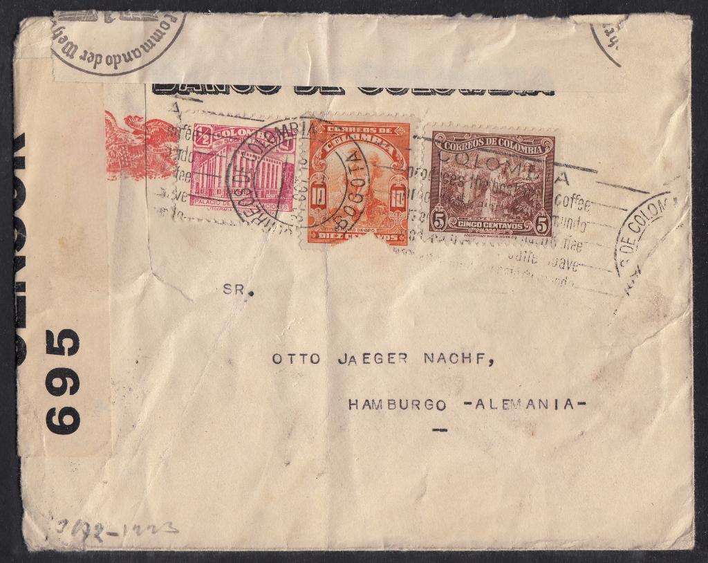 > Papier ist ein recht verletzliches Material. Da mutet es oft erstaunlich an, dass Briefe ihre lange Reise über Kontinente hinweg mitunter unversehrt überstanden. Bei diesem Brief aus Kolumbien ist das nicht so. Er wurde am 31. Oktober 1940 in Bogota aufgegeben und war an eine Firma in Hamburg adressiert. Der Brief durchlief zunächst die britische Zensurstelle in der Karibik und wurde zur Weiterbeförderung feigegeben, da Kolumbien sich im Zweiten Weltkrieg zu dieser Zeit neutral verhielt. Irgendwann, wir wissen es nicht, traf der Brief in Deutschland ein und gelangte dort zur Zensurstelle in Frankfurt (Main), die eingehende Post aus Südamerika bearbeitete. Irgendwo auf der etwa 15.000 Kilometer langen Reise war er beschädigt worden, auch eine der Marken hatte gelitten. Der Zensor in Frankfurt vermerkte den beschädigten Zustand mit einem Hinweisstempel, um die Dienststelle zu entlasten. Der Stempel ist sehr selten und kaum je dokumentiert worden. Von Frankfurt aus wurde der abermals zensierte Brief dann nach Hamburg befördert. Absender war übrigens die "Banco de Columbia" - der Empfänger dürfte auf Geld oder Kontoauszüge gewartet haben.