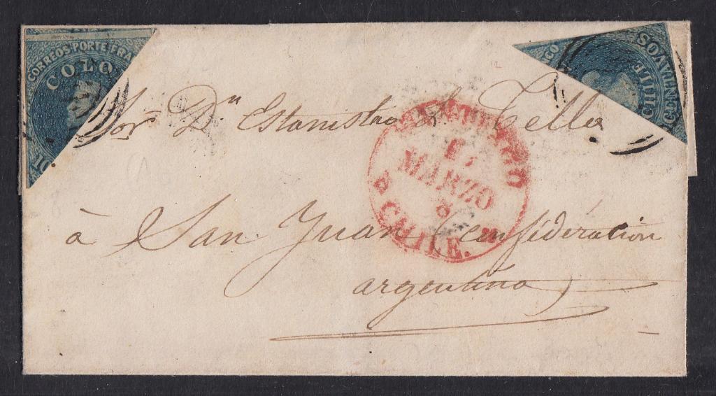 > Seit Herbst 1853 war es in Chile erlaubt, bei einem Mangel des 5-Centavos-Wertes den 10-Centavos-Wert diagonal zu halbieren. Diese Regelung galt bis Ende 1861, obwohl es zwischenzeitlich ausreichend Briefmarken gab - man hatte sich offenbar auf den Postämtern an das Zerschneiden der Marken gewöhnt. Der oben gezeigte Brief ist in dieser Hinsicht besonders kurios: Er wurde am 15. März 1858 beim Postamt in Santiago eingeliefert und ist nach San Juan im Nordwesten Argentiniens gerichtet. Zu frankieren war er mit 10 Centavos. Doch wohin die Marke kleben, wenn der Absender den kleinen Umschlag schon mit der Adresse vollgeschrieben hat, mag sich der Postbeamte gedacht haben. Also griff er zur Schere, zerteilte die Marke und klebte die Hälften in die Ecken des Umschlages. Der Brief war nun korrekt frankiert und die Marken, wie in der Postordnung verlangt, vorderseitig verklebt. Man muss sich eben zu helfen wissen.