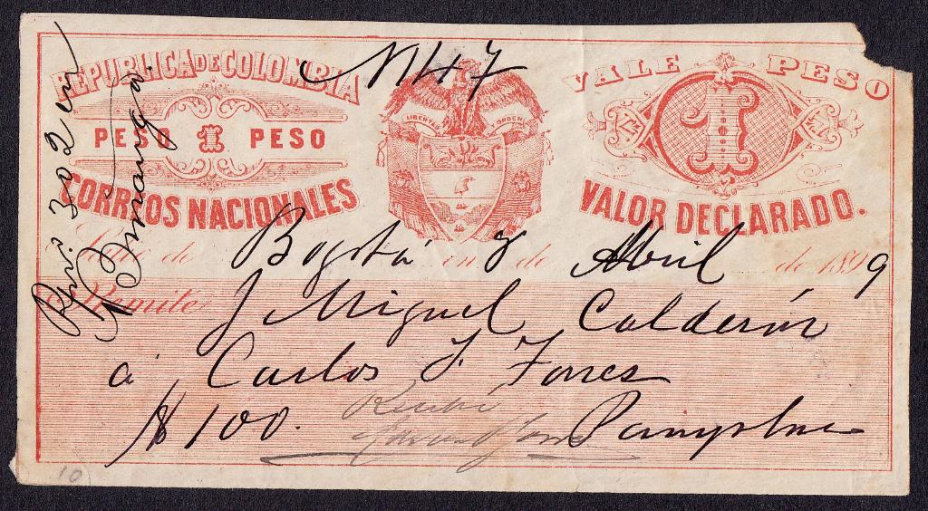 > Wertbriefe waren früher ein unverzichtbarer Teil des Geschäftslebens. Mit ihnen bezahlte man bar seine Rechnungen, denn Girokonten in der heutigen Form gab es im 19. Jahrhundert noch nicht, und über Bankkonten verfügte auch nicht jeder. Kolumbien hatte sich eine extravagante Form der Wertbriefbehandlung ausgedacht. Frankiert wurden die Kuverts nicht mit Marken, sondern mit besonderen Wertaufklebern mit eingedruckter Portoangabe - Ganzsachen gewissermaßen. Bei der Zustellung quittierte dann der Empfänger den Erhalt der Sendung; der Coupon wurde abgetrennt und verblieb als Auslieferungsnachweis bei der Post. Der hier gezeigte Aufkleber wurde am 8. April 1899 in Bogota verwendet und diente zum Versand eines Briefes im Wert von 100 Pesos - damals eine hohe Summe. Der Empfänger hat unten in der Mitte unterschrieben. Da die Aufkleber schön gestaltet wurden, sind sie heute ein beliebtes Sammelobjekt.