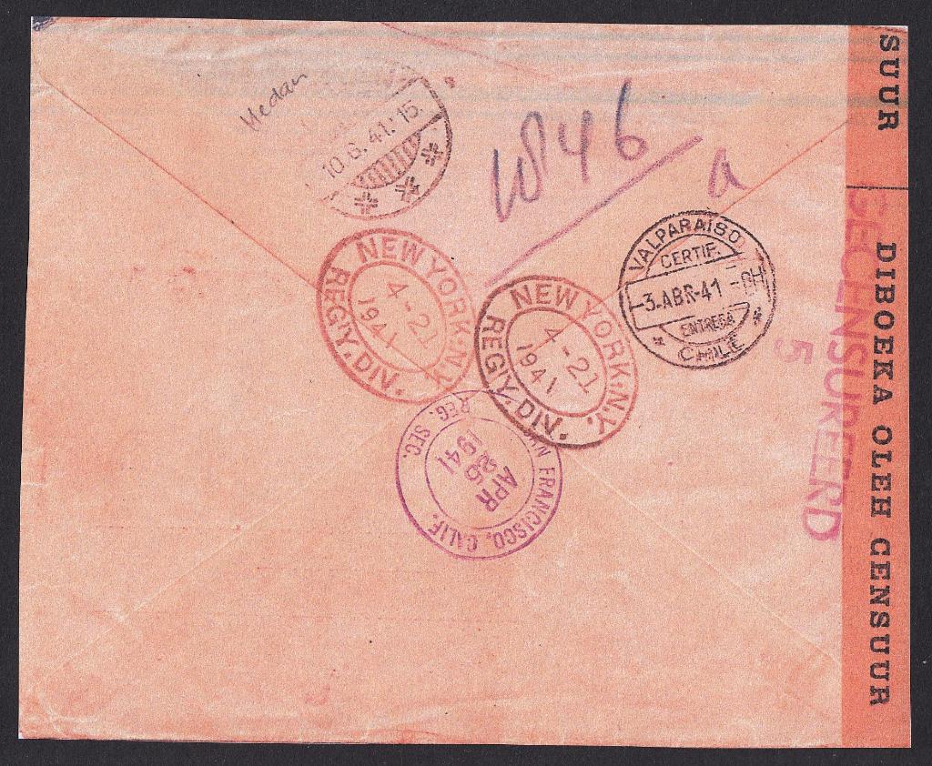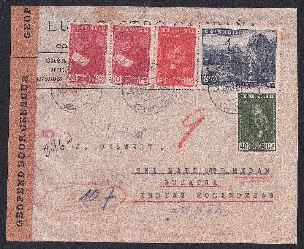 > Briefe mit seltenen Destinationen gehören seit einigen Jahren zu den Höhepunkten einer Sammlung. Wenn sie dann noch aus einer schweren Zeit stammen, sind sie ganz besonders interessant. Der eingeschriebene Brief aus Chile hier wurde am 1. April 1941 in Serena zur Post gegeben und war nach Niederländisch-Indien adressiert. Er passierte auf dem Schiff den Panamakanal, durchlief New York, und nach einer Reise mit der transkontinentalen Eisenbahn erreichte er San Francisco. Am 10. Juni kam er per Schiff in Sumatra an - ein schnelles Tempo für die Kriegszeit. Kurze Zeit später wurde die niederländische Kolonie von Japan besetzt. Der Brief ist zusätzlich attraktiv, weil er ausschließlich mit Marken aus dem Satz zum Jubiläum der spanischen Kolonialisierung Chiles frankiert wurde.