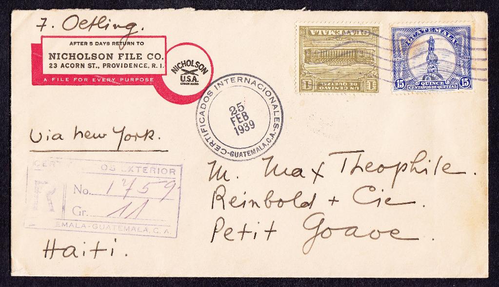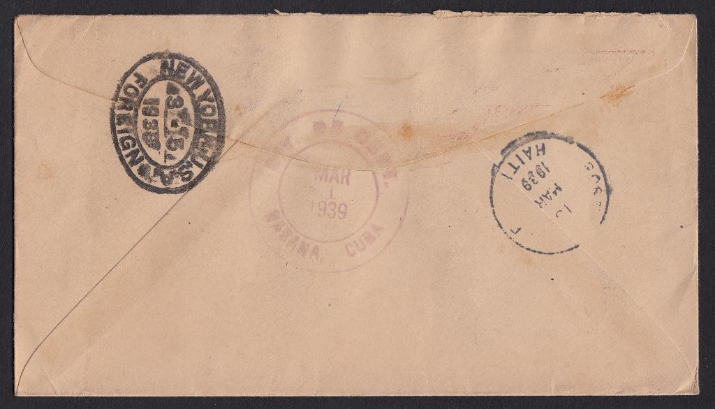 > Postsendungen - das sind gemeinhin Stücke, die von A nach B befördert werden. So ist es oft, aber eben nicht immer - und das macht die Philatelie interessant. Dieser eingeschriebene Brief hier wurde wurde am 25. Februar 1939 von einem US-Amerikaner aus dem Neuengland-Staat Rhode Island in Guatemala zur Post gegeben. Adressiert war er nach Haiti - eine immer recht seltene Destination. Man darf annehmen, dass der Brief direkt in östliche Richtung in die Karibik befördert wurde. So war es aber nicht: Der Brief erreichte am 1. März Kubas Hauptstadt Havanna und reiste dann Richtung Norden nach New York; ganz so, wie es der Absender gewünscht hatte. Am 5. März kam er in der Hafenstadt an der US-Ostküste an und am 10. März dann am Empfangsort. Warum der Umweg gewählt wurde, ist unklar. Möglicherweise lag das daran, dass Haiti französisch geprägt war und Schiffe dorthin - vermutlich französische Schiffe - nur ab New York fuhren. Man sieht: Interessante Leitwege sind nicht nur auf Post des 19. Jahrhunderts zu finden.