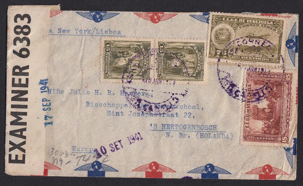 > Im 19. Jahrhundert benötigte ein Brief mit dem Schiff von Venezuela bis Europa etwa drei Wochen. Später beschleunigten Flugzeuge die Postbeförderung. Doch im Zweiten Weltkrieg dehnten sich die Laufzeiten der Briefe aus Südamerika wieder extrem aus. Der oben gezeigte Brief wurde am 17. Juni 1941 in der Hauptstadt Caracas zur Post gegeben - und erreichte den Empfänger erst etwa drei Monate Später. Die Schneckenleistung war mit den Wirren des Krieges begründet. Der Brief durchlief die US-Zensurstelle auf den Bahamas, wurde dann über New York und Lissabon mit dem Flugzeug befördert und von dort per Bahn über Spanien weiter Richtung Norden. Die deutsche Zensurstelle Köln prüfte den Inhalt abermals. Vermutlich am 17. September 1941 traf er am Bestimmungsort ein. Eine großartige Leistung trotz allem, denn die Widrigkeiten jener Zeit sollte man nicht unterschätzen.