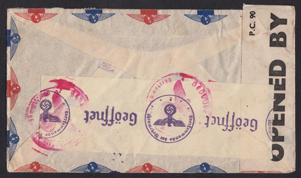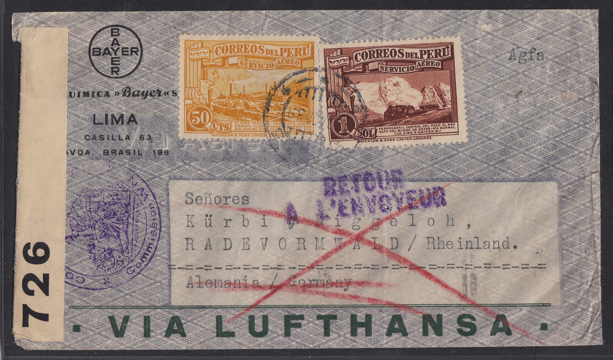 > Mit dem von Nazideutschland ausgelösten Zweiten Weltkrieg wurde auch der Luftpostverkehr von und nach Lateinamerika empfindlich getroffen. Die französische Air France flog zwar ab September 1939 noch; doch Briefe nach Deutschland wurden nicht mehr weitergeleitet, da beide Länder im Kriegszustand waren. Dieser Brief hier wurde im Dezember 1939 in Lima aufgegeben, der Hauptstadt von Peru. Der Absender wusste wohl um die Schwierigkeiten und hatte mit dem Umschlag um eine Beförderung mit der "Lufthansa", also einem deutschen Dienst, gebeten. Befördert wurde er dann aber mit der Air France, auf den Bermudas von den Briten zensiert und auch in Frankreich geprüft. Da eine Weiterleitung nicht möglich war, wurde er wieder zurückgeschickt. Ob der Absender, die bekannten Bayer-Werke mit einer Dependance in Lima, wohl erneut versucht hat, einen Brief zu versenden?