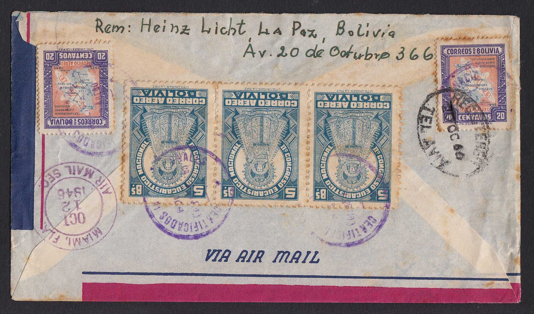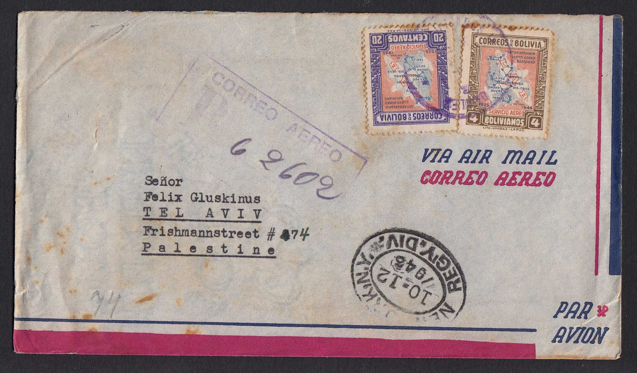 > Das Jahr 1946 - die Schrecken des Zweiten Weltkrieges lagen nur wenige Monate zurück. Und überall auf der Welt mussten sich Menschen, die vor dem Nazi-Regime geflüchtet waren, neu orientieren. Blieb man in der neuen Heimat? Kehrte man nach Deutschland zurück? Oder, wenn man jüdischer Flüchtling war, gab es eine Möglichkeit, nach Palästina, der kommenden Heimstätte der Juden aus aller Welt, zu emigrieren? Wir wissen nicht, was Heinz Licht Ende September 1946 seinem Freund Felix Gluskinus in Tel Aviv geschrieben hat, der Inhalt des eingeschriebenen Luftpostbriefes aus La Paz in Bolivien fehlt leider. Vielleicht kannten sich beide noch aus ihrer Zeit in Deutschland? Konnte Felix Gluskinus Heinz Licht bei der Auswanderung nach Palästina helfen? Sicher ist: Der Brief macht deutlich, dass jeder postgeschichtliche Brief ein Fenster der Geschichte öffnet.