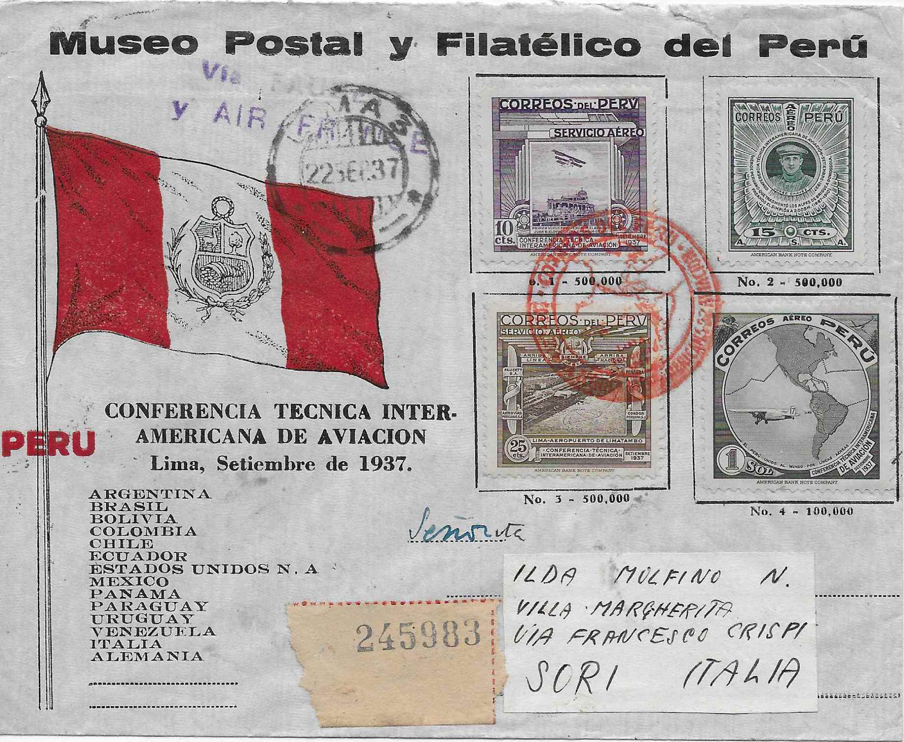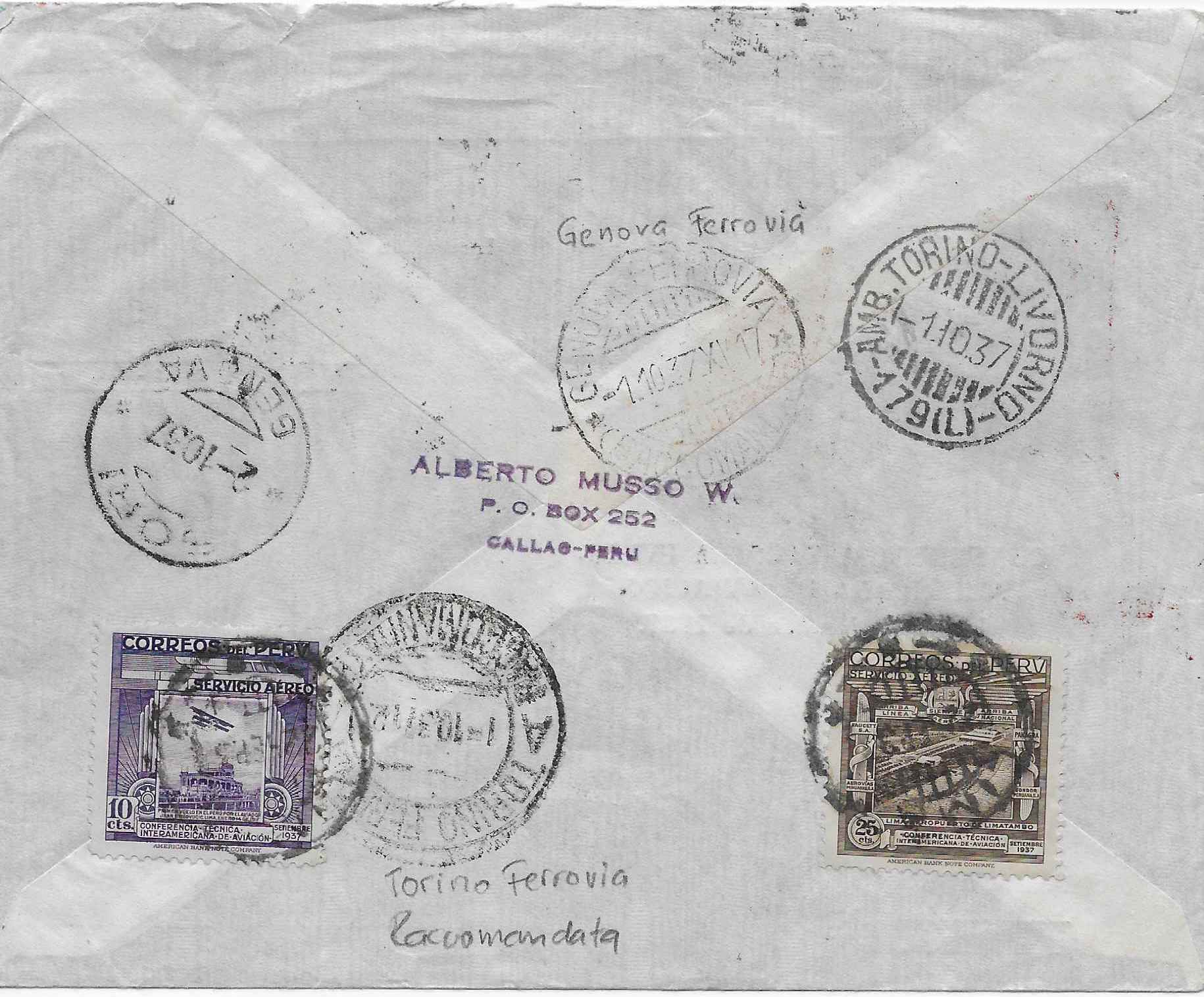 > Anlässlich der Interamerikanischen Luftverkehrskonferenz 1937 wurden in Peru vier Luftpostmarken ausgegeben. Obenstehender Brief wurde via Faucett (Compania de Aviacion Faucett SA.) und Air France, blauer Stempel oben links, nach Torino befördert. Von da aus ging dann die Reise mit der Bahnpost weiter nach Genua - bis der Empfänger im kleinen Dorf Sori östlich von Genua erreicht wurde, was die Stempel auf der Briefrückseite belegen. Auf der 15-Centavos-Marke sehen wir das Porträt von Jorge Chavez, der auch hier in Europa kein Unbekannter ist - durch seinen Erstflug über die Alpen, Brig –Domodossola, der leider infolge Absturz bei der Landung für den Pilot tödlich endete. Das Briefporto setzt sich wie folgt zusammen: Luftpost Peru bis Europa 1.65 Peso plus 20 Centavos Einschreiben.