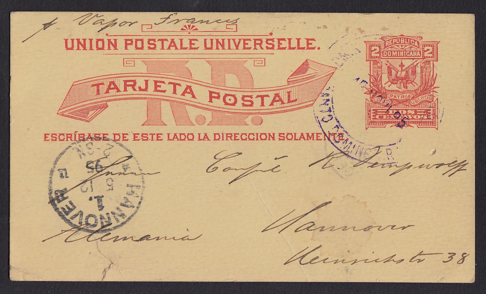 > Urlaub in der Dominikanischen Republik? Heute gilt der Karibikstaat längst nicht mehr als exotisches Reiseziel. Massentourismus aus Europa und Nordamerika spülen viel Geld in die Staatskasse. Das war natürlich nicht immer so - schon allein deshalb nicht, weil das Land in der Zeit, als Segelflüge schon eine Pionierleistung waren, nur sehr zeitraubend zu erreichen war. Diese Auslandsganzsache hier wurde in Santo Domingo, der Hauptstadt, am 15. November 1895 aufgegeben und erreichte den Bestimmungsort Hannover in Deutschland am 5. Dezember. Für die damalige Zeit ein beeindruckendes Tempo, doch für einen Urlaub dauerte die An- und Abreise damals dann doch wohl zu lange.