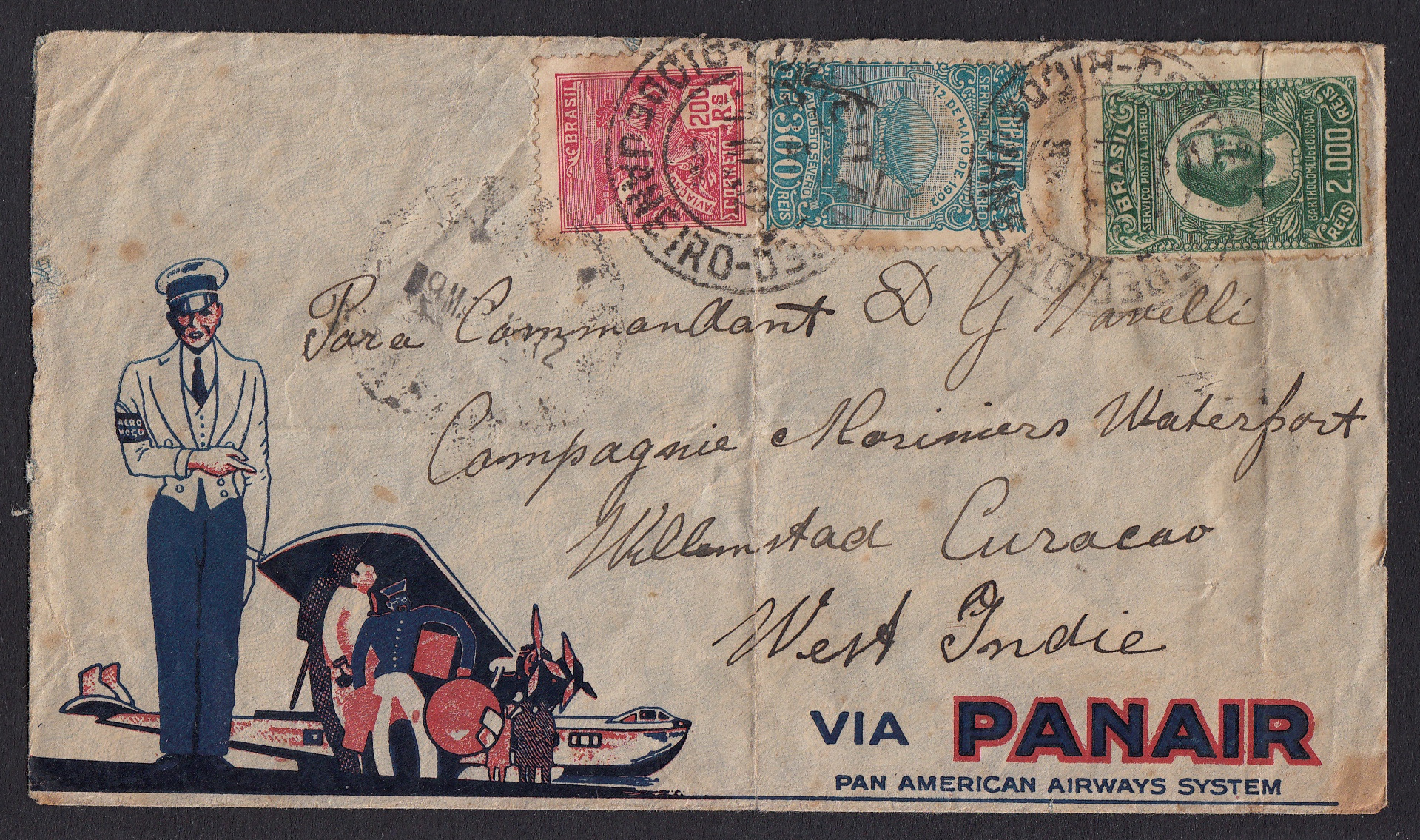 > Über Flugreisende hat in jüngster Vergangenheit der Inhaber einer Billigfluglinie einmal gespottet, Passagiere seien nichts weiter als "sich selbst verladenes Gepäck". In der Zeit zwischen den Weltkrieges war eine Flugreise hingegen ein Vergnügen für die betuchte Oberschicht wie dieser dekorative Luftpostbrief aus Brasilien von 1932 veranschaulicht. Wo findet man heute noch einen so adretten Steward am Flughafen? Und war hat noch einen Dienstboten auf dem Weg zum Flugzeug an seiner Seite, der für einen die Koffer wuchtet? Niemand, die Zeit ist vorbei, dafür dürfte heute selbst die Holzklasse bequemer sein als der Komfort damaliger Propellermaschinen. Recht schnell waren die auch schon: Der Brief hier wurde am 11. März 1932 in Rio de Janeiro aufgegeben und war bereits, befördert durch die US-Fluggesellschaft Panair, am Folgetag auf den Niederländischen Antillen. Ob das die Post heute auch noch schafft?