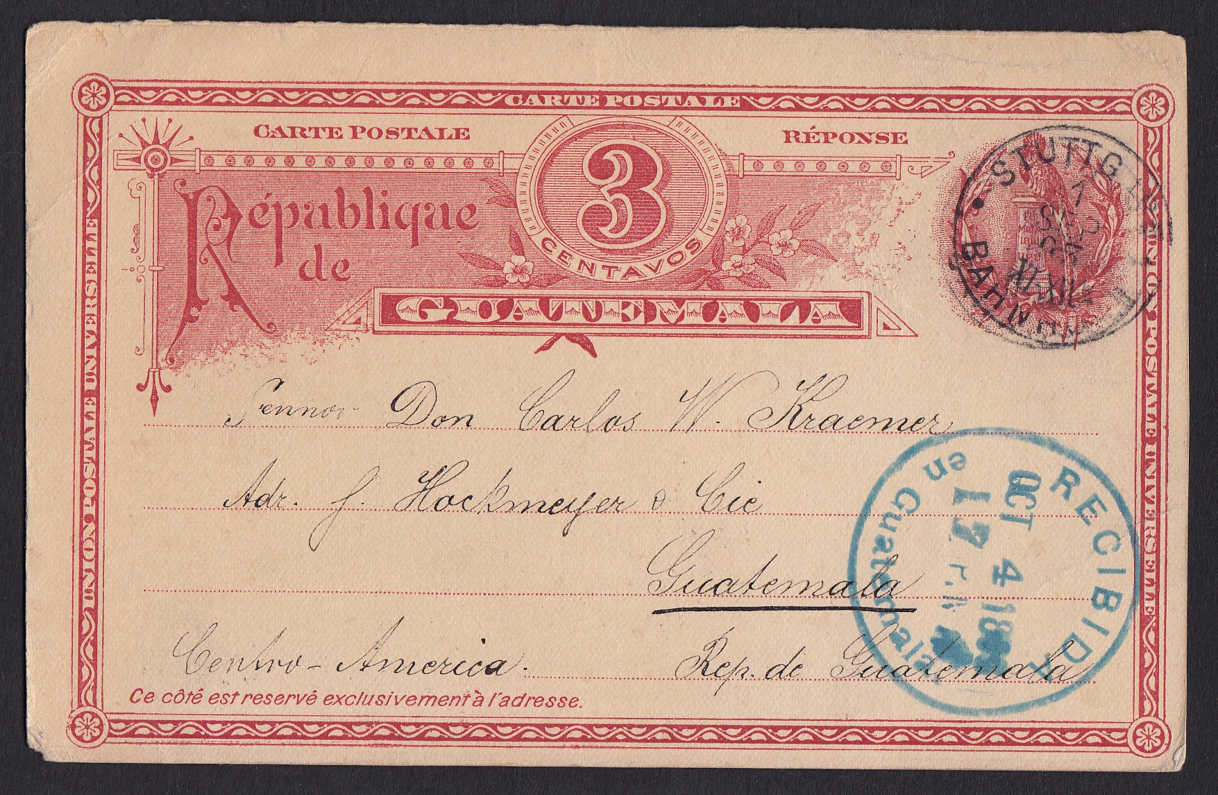 > Eine Antwort auf eine Frage ist in unserer Zeit oft nur eine Frage von Sekunden - Telefone, E-Mails oder andere Messangerdienste machen es möglich. Früher indes musste man viel Geduld haben. Irgendwann im Sommer 1895 richtete ein Carlos W. Kraemer aus Guatemala-Stadt eine Anfrage in die alte Heimat Deutschland, nach Stuttgart. Er verwendete eine sogenannte Antwortkarte, deren anhängender Teil als vorausbezahlte Rückantwort weltweit nutzbar war. Am 1. September 1895 gab dann der Empfänger den Antwortteil in Stuttgart zur Post, am 4. Oktober traf die Karte in Guatemala ein. Vermutlich hat die Klärung der Angelegenheit alles in allem etwa ein Vierteljahr gedauert. Dafür dürfte der Absender seine Worte aber gut gewählt haben. Das ist in unseren schwatzhaften Zeiten nicht immer so.