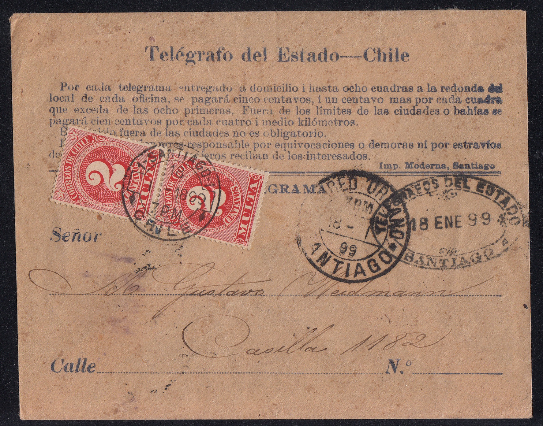 > Wer heute eine schnelle Nachricht loswerden möchte, der greift zum (Mobil-)Telefon, schreibt eine Mail oder SMS oder versendet eine What's-App-Nachricht. Das war früher natürlich nicht möglich. Die schnellste Form der Nachrichtenübermittlung an Jedermann war das Telegramm. Per Telegrafie - zunächst nur via Kabel, später auch drahtlos - kamen dringende Botschaften rasch an. Das war auch in Chile üblich. Überliefert sind schöne Belege mit eindrucksvoller Aufmachung. Gezeigt wird hier ein Umschlag der staatlichen Telegrafengesellschaft vom 18. Januar 1899, der innerhalb Santiagos lief. Mit ihm wurde die Botschaft an den Empfänger zugestellt. Der Ortsbrief kostete 2 Centavos. Warum hier das Strafporto (doppelter Portosatz) erhoben und mit Nachportomarken verklebt wurde, ist unklar. Vermutlich waren Post- und Telegrafenverwaltung organisatorisch getrennt. In jedem Fall macht der Beleg klar, dass die moderne Technik nicht solche Zeitzeugnisse zu hinterlassen vermag.