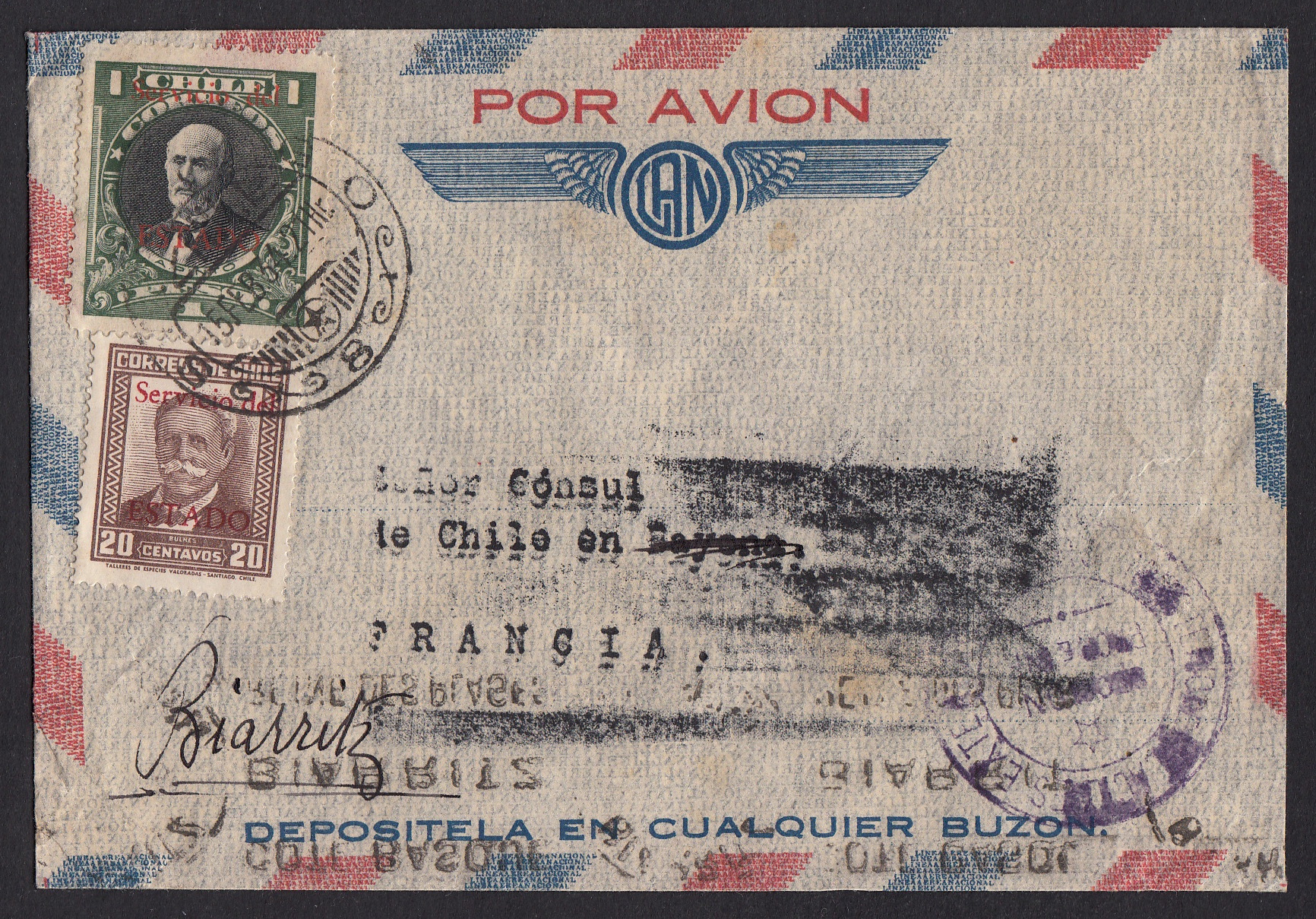 > Dienstbriefe sind gewöhnlich solche, die nur im Inland laufen. Auch die Marken, so ein Staat denn spezielle Postwertzeichen für den Dienstgebrauch verausgabte, waren oft nur im Inland gültig. Auch Chile hatte Dienstmarken in vielfältiger Ausführung - die als Auslandsverwendung möglich waren. Zu sehen ist hier ein Luftpostbrief vom 15. Februar 1934 aus Santiago; Absender ist das Außenministerium. Der Brief war zunächst an den Konsul in Bayonne gerichtet, wurde dann aber nach Biarritz weitergeleitet - der Konsul war vielleicht dort im Urlaub. Interessant sind diese Briefe auch deshalb, weil die Luftpostbeförderung Rätsel aufgibt. Die Marken im Wert von 1,20 Pesos decken nur den Tarif für einen Auslandsbrief ab. Der Luftpostzuschlag wurde vermutlich pauschal - entweder monatlich oder jährlich - vom chilenischen Staat an die Luftfahrtgesellschaft bezahlt. In diesen Jahren waren es die Franzosen, die den Transatlantikdienst aufrecht erhielten - mit der späteren Gesellschaft Air France.
