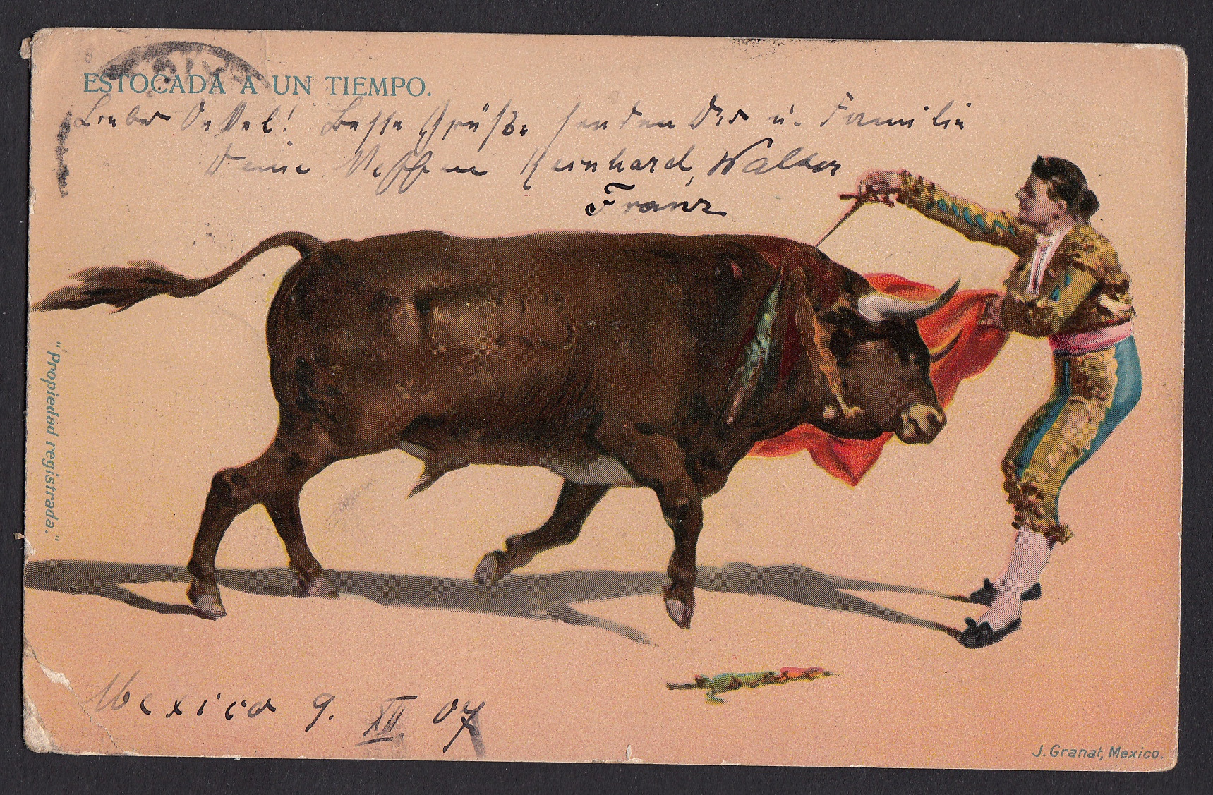 > Stierkampf - eine spanische Leidenschaft! Nur eine spanische? Offenbar auch ein mexikanisches Volksvergnügen, wie diese Postkarte aus dem Jahr 1907 beweist. Gerichtet war die Karte an den "lieben Onkel" in Deutschland. Und der war sicher erstaunt über die ungewöhnliche Optik aus dem fernen Mexiko.