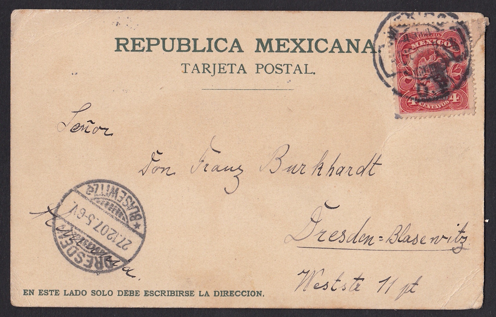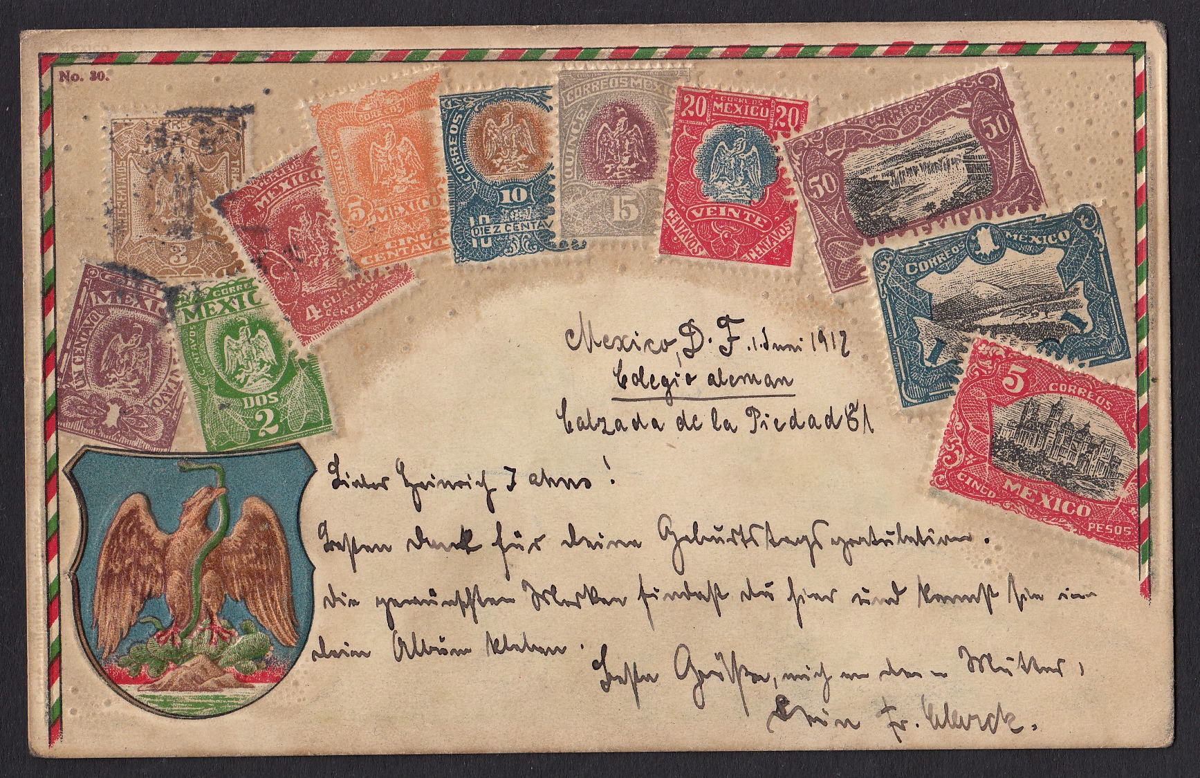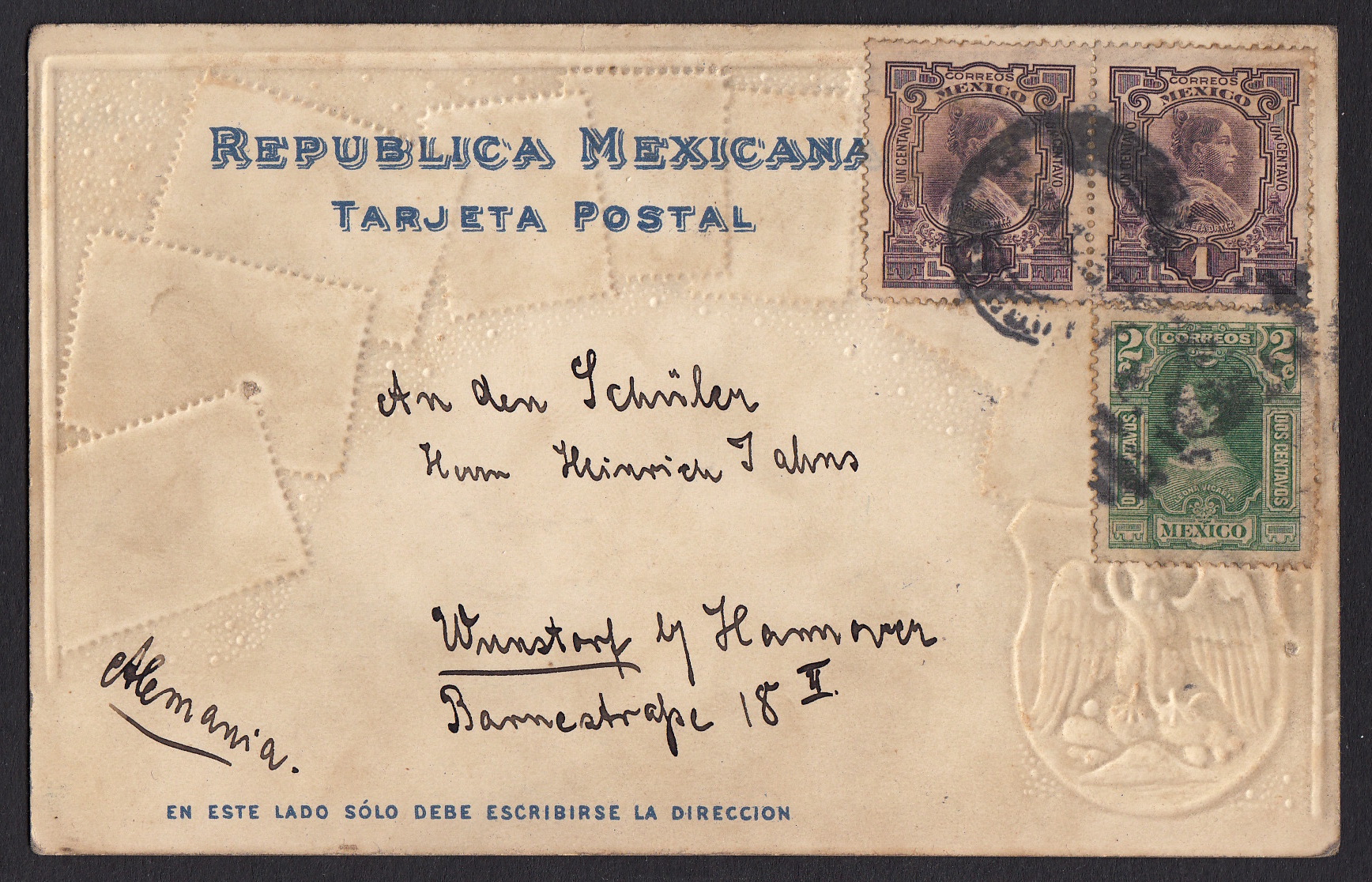 > Briefmarken wurden in früheren Jahren von Kindern weitaus häufiger gesammelt als dies heute der Fall ist. Gerade Marken aus fernen Ländern vermittelten einen kleinen Eindruck von der Kultur und dem Leben dort. Heute erhält man vielfältigere Eindrucke über die elektronischen Medien. 1912 war das anders. Der Schüler Heinrich Jahns in Wunstorf bei Hannover erhielt von einem Freund der Familie im fernen Mexiko eine schöne Postkarte mit "den gewünschten Marken", die er nun "in seinen Album kleben" könne. Zuvor hatte der Junge dem Bekannten zum Geburtstag gratuliert und ein paar Marken erbeten. Heinrich Jahns war offenbar ein aufgeweckter Schüler, denn er hat die Marken nicht abgelöst, sondern die dekorative Karte als ganzes in seine Sammlung getan.