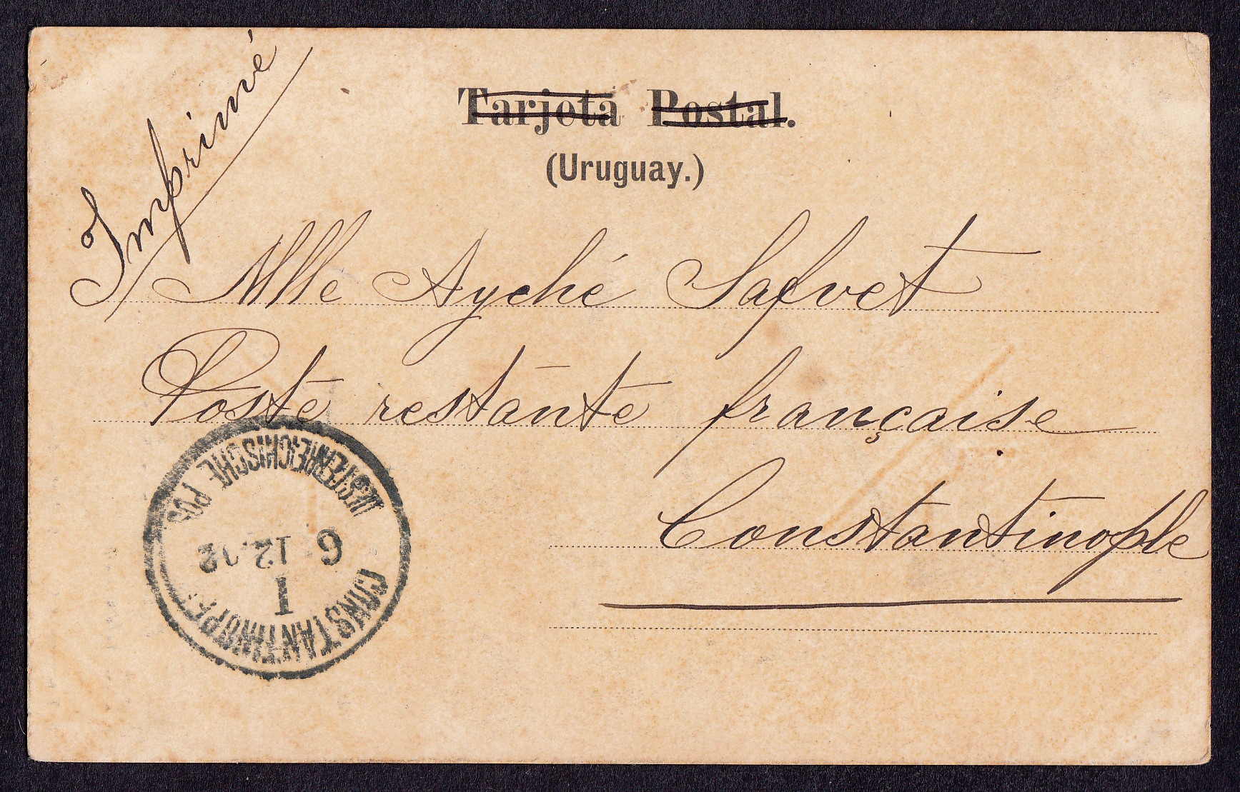 > Wer früher Post in die alte Welt schickte, der musste offenbar einiges über die dortigen Verhältnisse wissen. Diese Karte wurde im Herbst 1912 aus Montevideo in Uruguay in das Osmanische Reich geschickt - und der Absender wusste, dass es dort in Konstantinopel, der Stadt am Bosporus, Postämter diverser ausländischer Staaten gab. Adressiert hatte er die Karte, die als Drucksache gelaufen ist, an das französische Postamt. Bearbeitet wurde das Poststück dann aber vom österreichischen Postamt. Die Karte erreichte den Empfänger am 6. Dezember 1912 - und das wird dem Absender sicher das wichtigste gewesen sein.