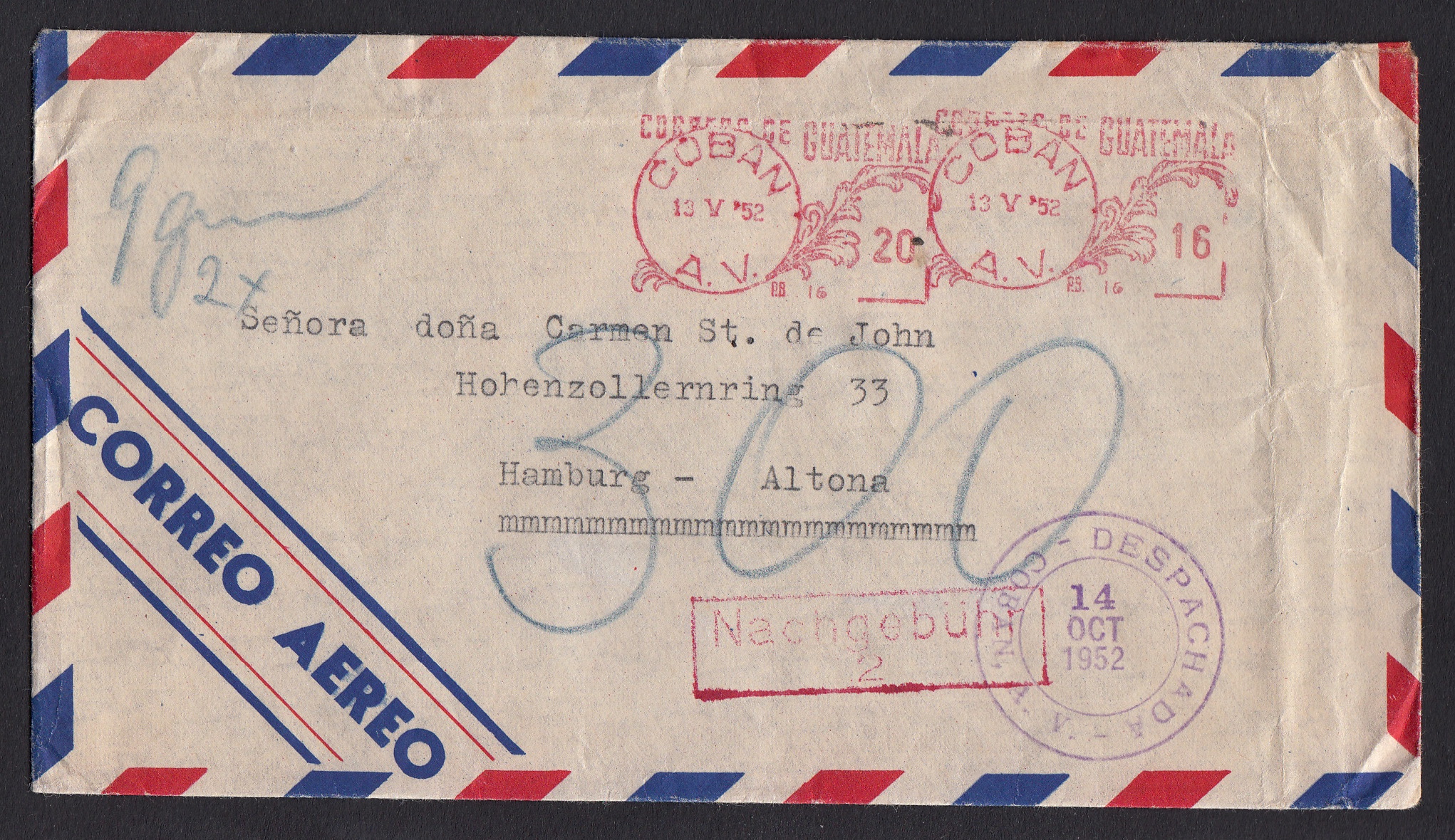 > Nachporto bezahlen zu müssen, ist immer eine recht ärgerliche Angelegenheit. Warum hat der Absender nicht korrekt frankiert? War es Gedankenlosigkeit oder war ich ihm nicht mal das Briefporto wert? Vielleicht hat das auch die Dame gedacht, die im Herbst 1952 in Hamburg in Portemonnaie greifen musste, um dem Postboten den Fehlbetrag für einen Brief aus Guatemala zu erstatten. Ein Herr Suevern in Coban hatte ihr einen Luftpostbrief geschickt, ihn mit 36 Centavos deutlich unterfrankiert. Merkwürdig, schließlich wurde der Brief mittels Freistempel bei der Post freigemacht. Aber dennoch wurden in Hamburg 300 Pfg., also drei Mark Nachporto fällig. Dafür musste ein Handwerker etwa zwei Stunden arbeiten. Hoffentlich war Herr Suevern oder der Briefinhalt den Betrag wert.