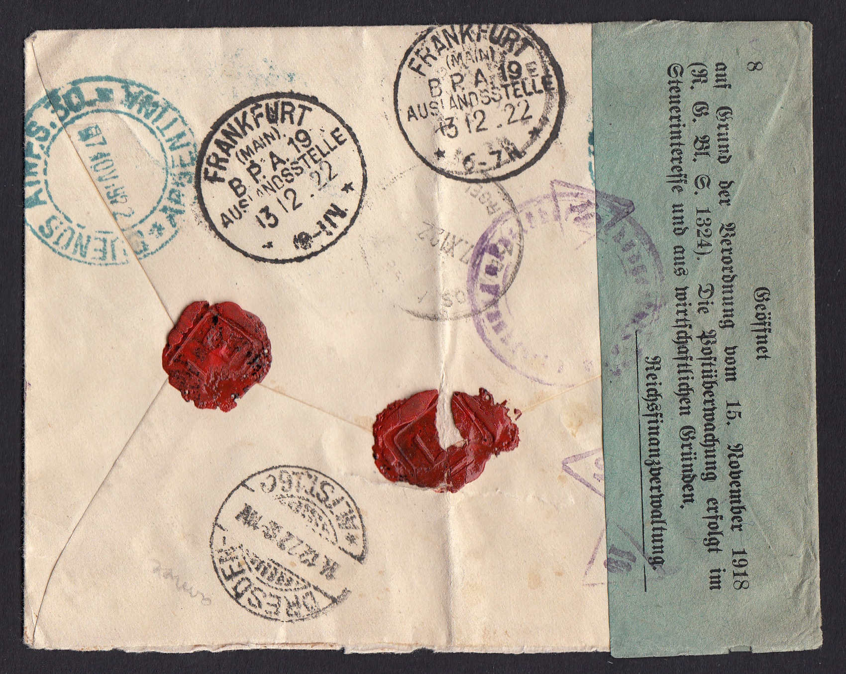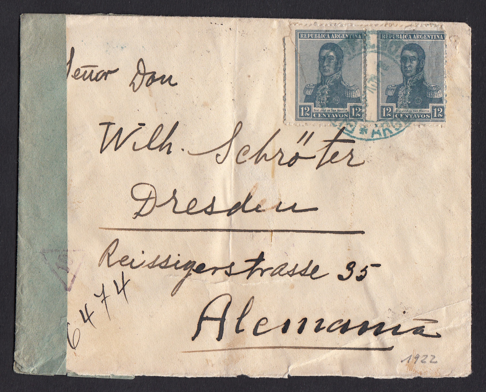 > Klar: Steuern zahlen ist wichtig; der Staat muss seine Gemeinwohlaufgaben erfüllen können. Aber dennoch schmerzt es immer ein wenig, wenn man etwas abgeben muss. Vielleicht musste dies auch Wilhelm Schröder, der 1922 in Dresden diesen Brief über 20 Gramm Gewicht aus Argentinien erhielt. Der Brief war am 7. November in Buenos Aires abgeschickt worden und traf am 13. Dezember bei der Auslandsstelle des Bahnpostamts 19 in Frankfurt/Main ein. Dort wurde er von einem Beamten der Reichsfinanzverwaltung geöffnet. Das Deutsche Reich litt damals unter einer hohen Inflation; zugleich drückten die Reparationslasten des Ersten Weltkriegs. Devisen waren knapp - und so wurden alle dickeren Briefe aus dem Ausland geöffnet um nachzuschauen, ob nicht werthaltige Banknoten darin waren. Bei Argentinien war das durchaus anzunehmen, gehörte es doch zu den reichsten Ländern der Welt. Nicht nur die Inflation, auch der Wohlstand Argentiniens ist Vergangenheit.