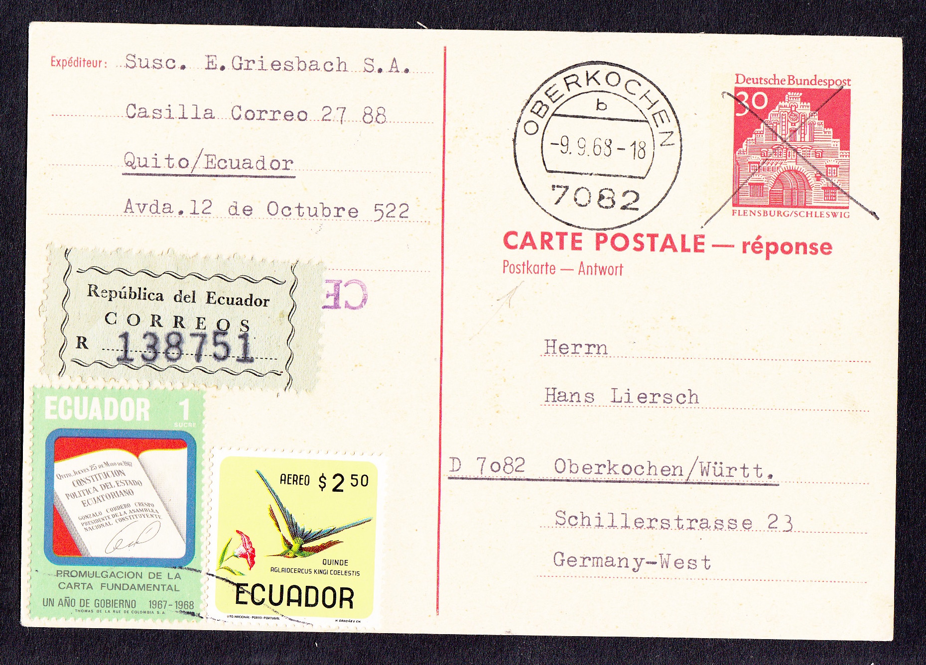 > Schnell und einfach antworten - das war seit 1886 weltweit mit der sogenannten Antwortkarte möglich. Der Wertstempel des Abgangslandes war damit auch im Empfängerland gültig. Bis 30. Juni 1971 gab es diesen Service, doch bereits in den Jahren davor war er nicht mehr sonderlich beliebt. Die Karte hier zeigt den letzten Wertstempel "Große Bauwerke" der Deutschen Bundespost, der für eine Auslandsantwortkarte verwendet wurde. Der Absender in Quito / Ecuador frankierte noch den Sonderdienst Einschreiben hinzu. Abstempeln mochte der Beamte in Quito den exotischen Wertstempel zunächst nicht; er durchbalkte ihn nur. Die Post in Oberkochen erledigte das dann.