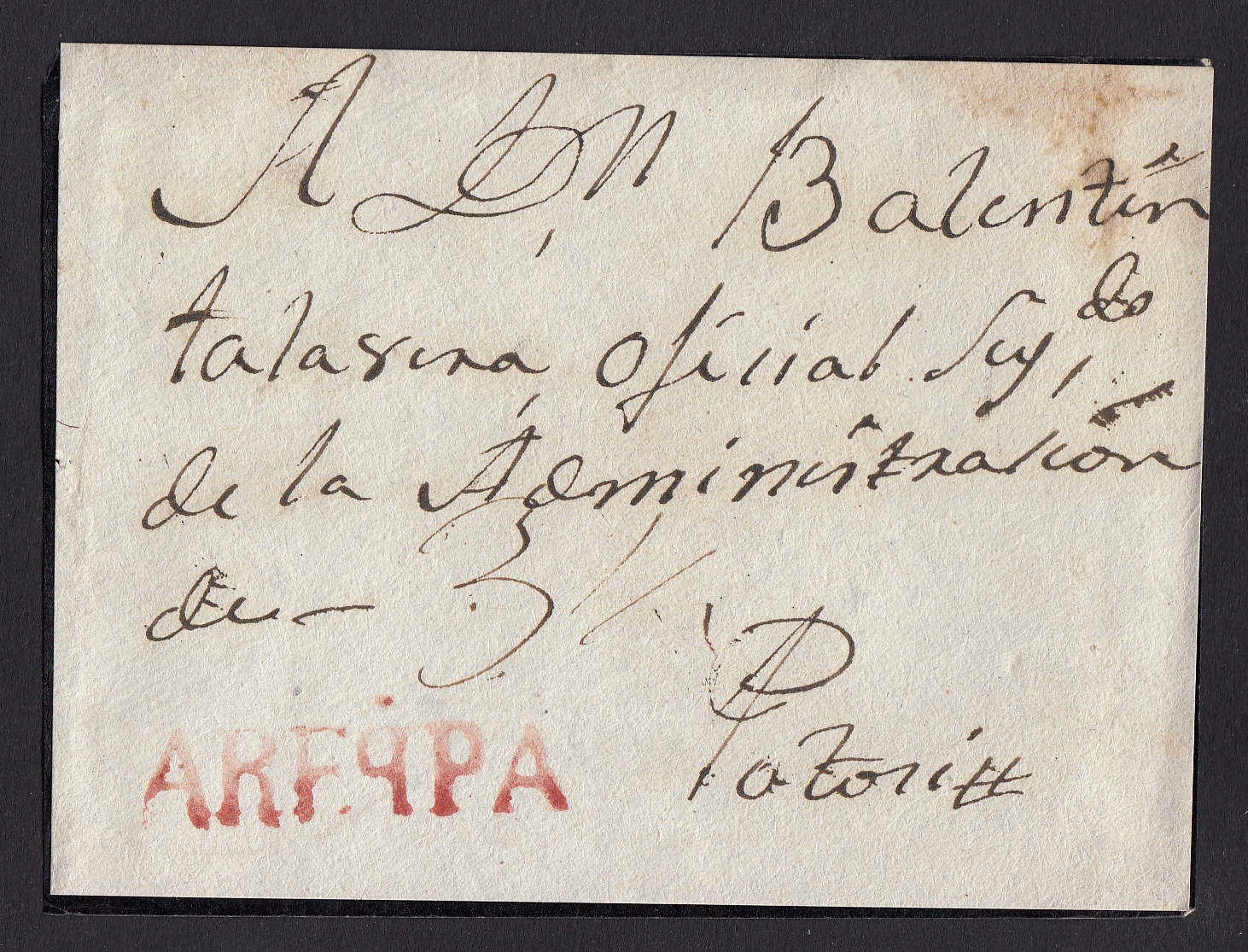 > Potosi? Wer kennt heute noch die Staat in Bolivien. Sie liegt am Fuß des Berges Cerro Rico (deutsch: Reicher Berg, dessen Silberreichtum Potosí im frühen 17. Jahrhundert zu einer der größten Städte der Welt machte und von dessen Silber- und Zinnvorkommen die Stadt noch heute abhängig ist. Der Absender dieses Briefes aus Arequipa / Peru, der ihn in der spanischen Kolonialzeit aufgab, benötigte vielleicht eines der Metalle. Wir wissen es nicht. Leider sind aus der spanischen Kolonialzeit oft nur Briefvorderseiten erhalten geblieben.