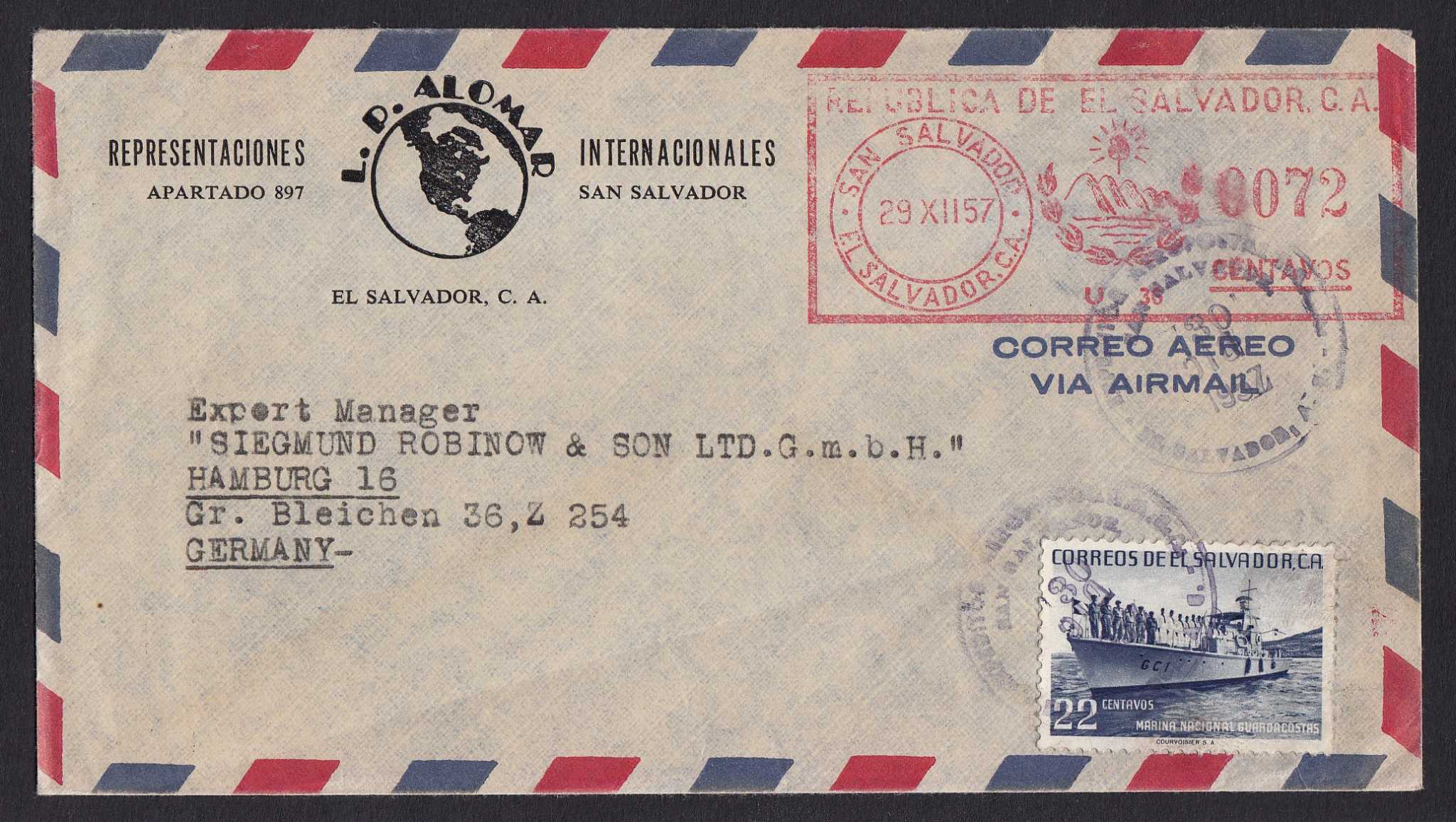 > Hoppla, wer hat sich da geirrt? Der Brief aus der Hauptstadt San Salvador in El Salvador war 1957 mit einem Freistempel zu 72 Centavos freigemacht worden. Aber das reichte offenbar nicht, und so wurde noch eine Marke im Wert von 22 Centavos hinzugeklebt, um das Porto nach Deutschland abbilden zu können. Immerhin ist so ein sehr dekorativer Brief entstanden.