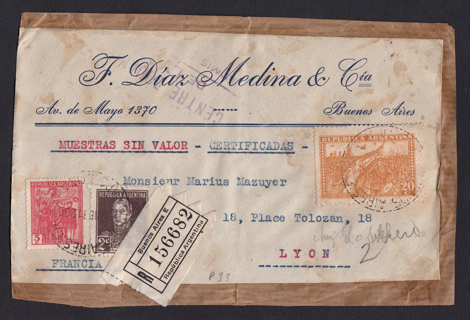 > Zugegeben: Sammler suchen heute immer den sauberen, weitgehend makellosen Beleg. Mitunter ist das aber unmöglich. Etliche seltene Portostufen lassen sich kaum in guter Erhaltung finden - wenn man sie denn überhaupt einmal entdeckt. Diese Vorderseite etwa ist rar, handelt es sich doch um eine Warenporobe per Einschreiben aus Argentinien. Oft waren die Versandtaschen voluminös; die Marken hafteten nicht richtig, rissen aus dem langen Postweg ein und wurden zudem noch unzulänglich gestempelt. Meist landeten diese Belege im Müll. Bei diesem hier aus dem Jahr 1931 wurde wenigstens die Vorderseite aufbewahrt.