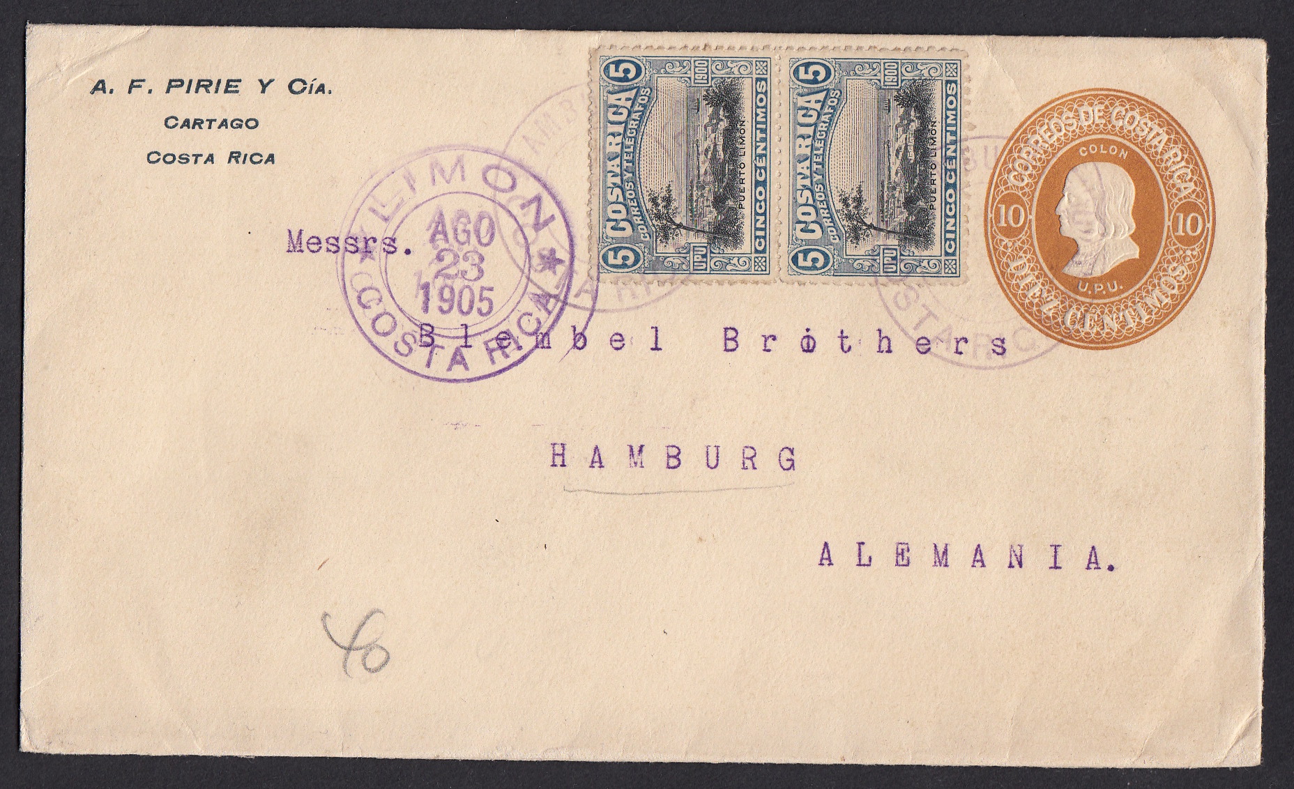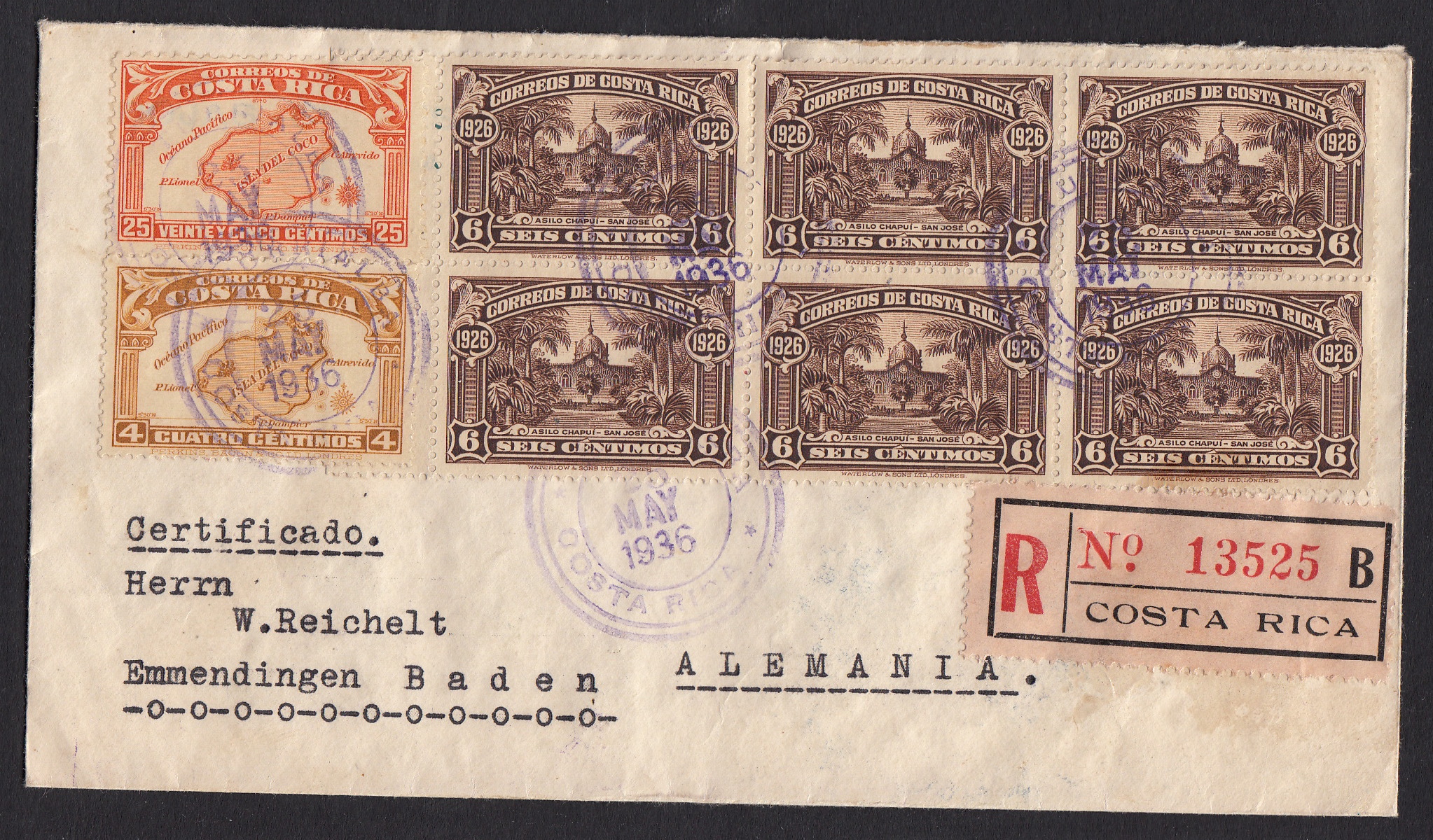 Der Absender dieses Briefes, ein Herr Westermann aus Costa Rica, war begeisteter Briefmarkensammler. Er war um 1912 aus Deutschland nach Costa Rica ausgewandert, um als Verwalter einer Kaffeeplantage zu arbeiten. In seine Heimat unterhielt er weiter vielfältige Verbindungen, um sein Hobby zu pflegen. Der Empfänger dieses Briefes aus dem Jahr 1936 dürfte sich besonderes über die schöne Frankatur gefreut haben. Um 1950 ist Herr Westermann übrigens nach Deutschland zurückgekehrt. Er hatte einen Bauernhof im niedersächsischen Bassum geerbt. Seine Sammlung brachte er natürlich mit.