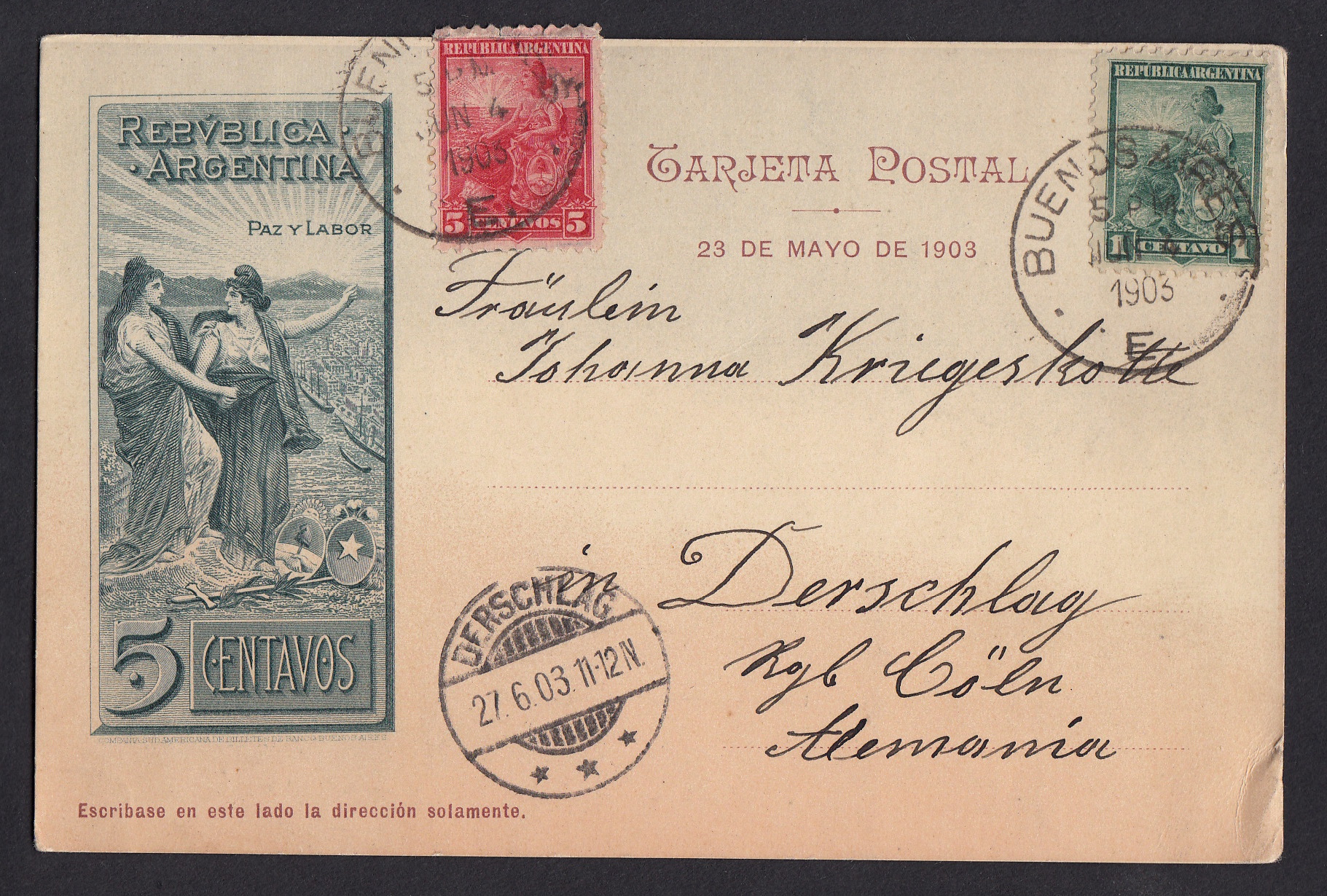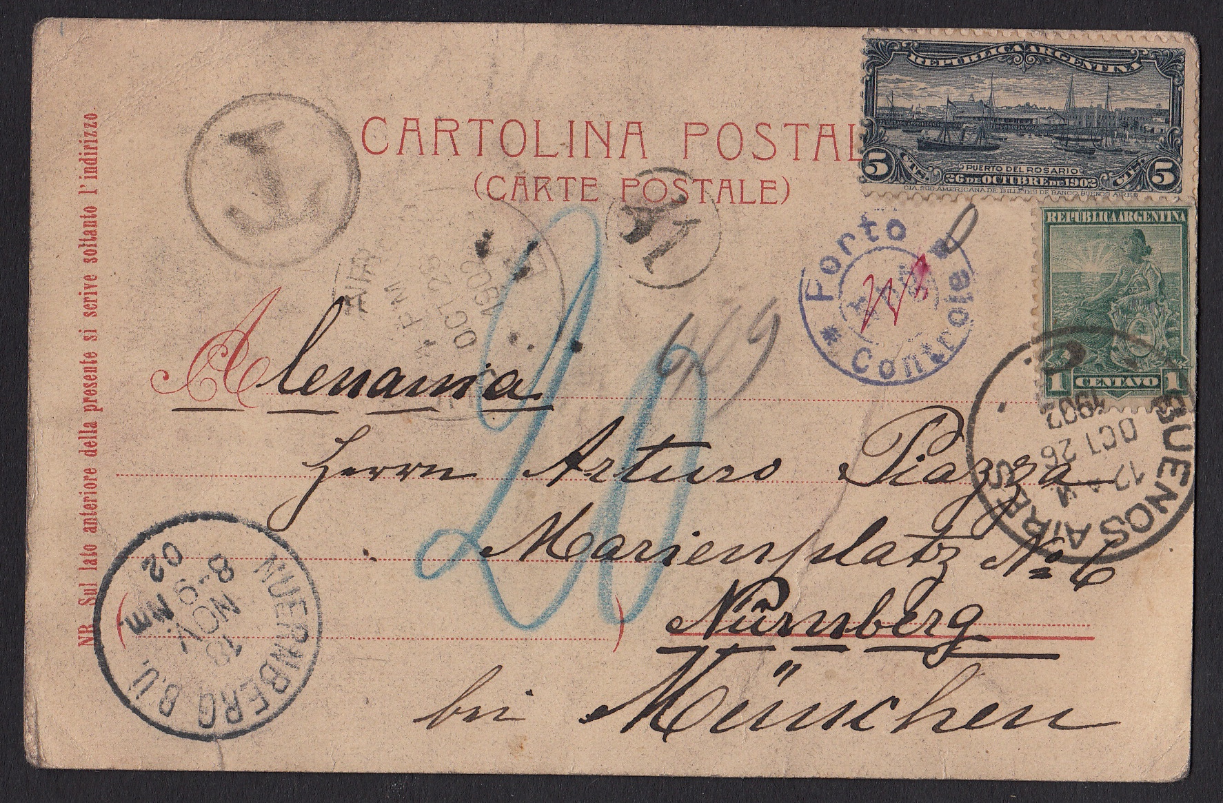 1902 gab es in der argentischen Stadt Rosario etwas großes zu feiern. Der neue Hafen der Stadt war fertiggestellt und so entschloss sich die Postverwaltung, zu dem Ereignis seiner Eröffnung eine Sonderbriefmarke herauszugeben. Das kuriose an der schön gestalteten Marke: Sie war nur am Ausgabetag, dem 26. Oktober 1902, und nur im Inland gültig - eine philatelistische Eintagsfliege gewissermaßen. Auch eine Dame Teresa S. de R., so ihre Unterschrift auf der Rückseite, wusste von der Marke und wollte einem Bekannten im fernen Nürnberg eine Freude bereiten. Am Ausgabetag frankierte sie eine Postkarte mit der Rosario-Marke und eine 1-Centavo-Freimarke portorichtig auf einer Postkarte. Die Marke, so schreibt die Absenderin, "wird mit der Zeit eine Seltenheit sein". Leider war die Marke auf der Auslandskarte ungültig. Die Post in Buenos Aires stempelte nur die Freimarke ab, die vermeindliche Rarität wurde mit einer "0" als ungültig gekennzeichnet. In Nürnberg wurde der in Argentinien erreichnete Fehlbetrag von 0,09 Goldfranc in 20 Pfennig umgerechnet. Herausgekommen ist trotdem ein seltenes und dekoratives Stück, das die Jahrzehnte überdauert hat.