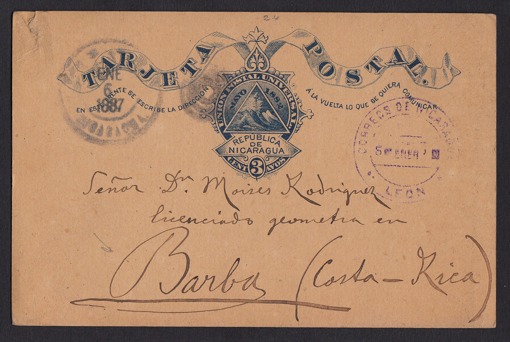 > Ganzsachen lassen sich auch besonders attraktiv gestalten. Diese Postkarte aus Nicaragua aus dem Jahr 1887 ist ein Beispiel dafür. Sie wurde in Leon aufgegeben und ist in das Nachbarland Casta Rica adressiert. Bestätigt wird der Erhalt eines Telegramms Postkarten werden heute immer weniger verschickt; Telegramme gibt es schon nicht mehr. So ändern sich nicht nur bei der Ganzsachengestaltung die Zeiten.