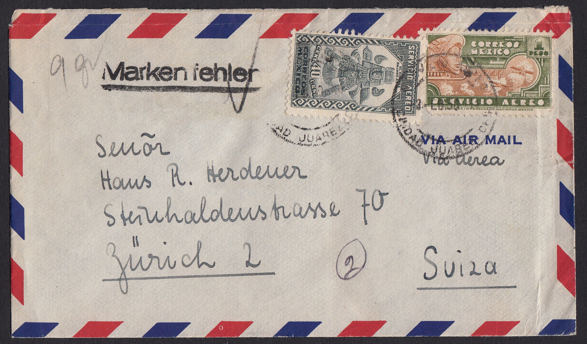 > Marken aufkleben, stempeln, in die Abgangsost geben. Das hatte auch der Postbeamte im Postamt von Juarez in Mexiko 1950 so getan und den Brief in die weit entfernte Schweiz geschickt. Irgendwo unterwegs fiel dann links auf dem Umschlag eine Marke ab - oder wurde von einem sammelnden Postmitarbeiter abgelöst, auch das gab es. In Zürich wurde das Malheur erkannt und ein entsprechender Stempel abgeschlagen - andernfalls hätte der Empfänger noch Nachporto bezahlen müssen.