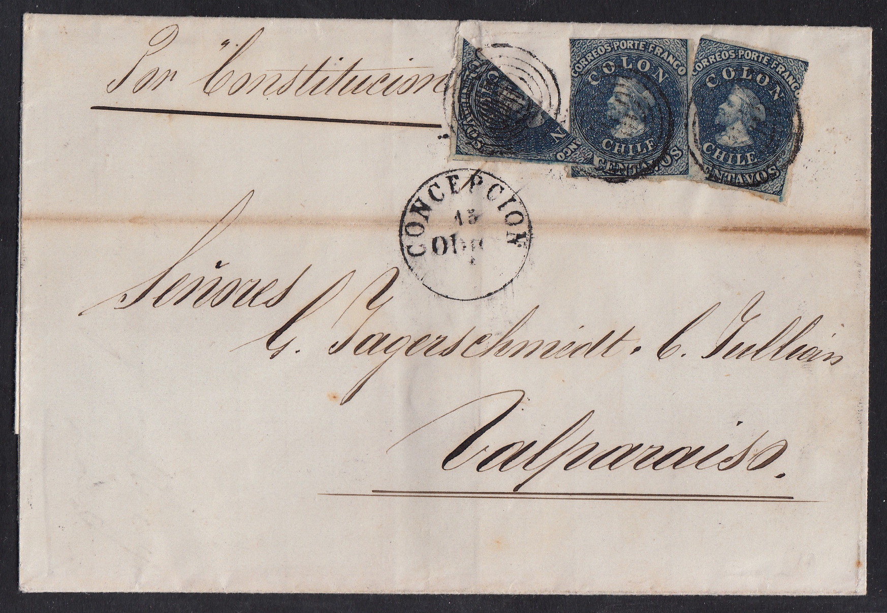 > Landwege waren im 19. Jahrhundert oft beschwerlich; der Seeweg war oft schneller. Das war auch in Chile so, das in Nord-Süd-Ausdehnung über tausende Kilometer Küste verfügt. Dieser Brief hier vom 15. Oktober 1856 wurde in Conception aufgegeben und reiste mit dem Küstenschiff "Constitution" nordwärts nach Valparaiso. Der Brief kostete 20 Centavos in der Gewichtsstufe bis eine Unze (28,8 Gramm) und einen Schiffpostzuschlag von 5 Centavos, der mit einer halbierten Marke bezahlt wurde.
