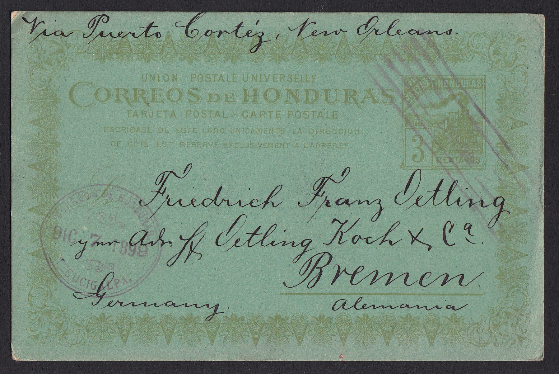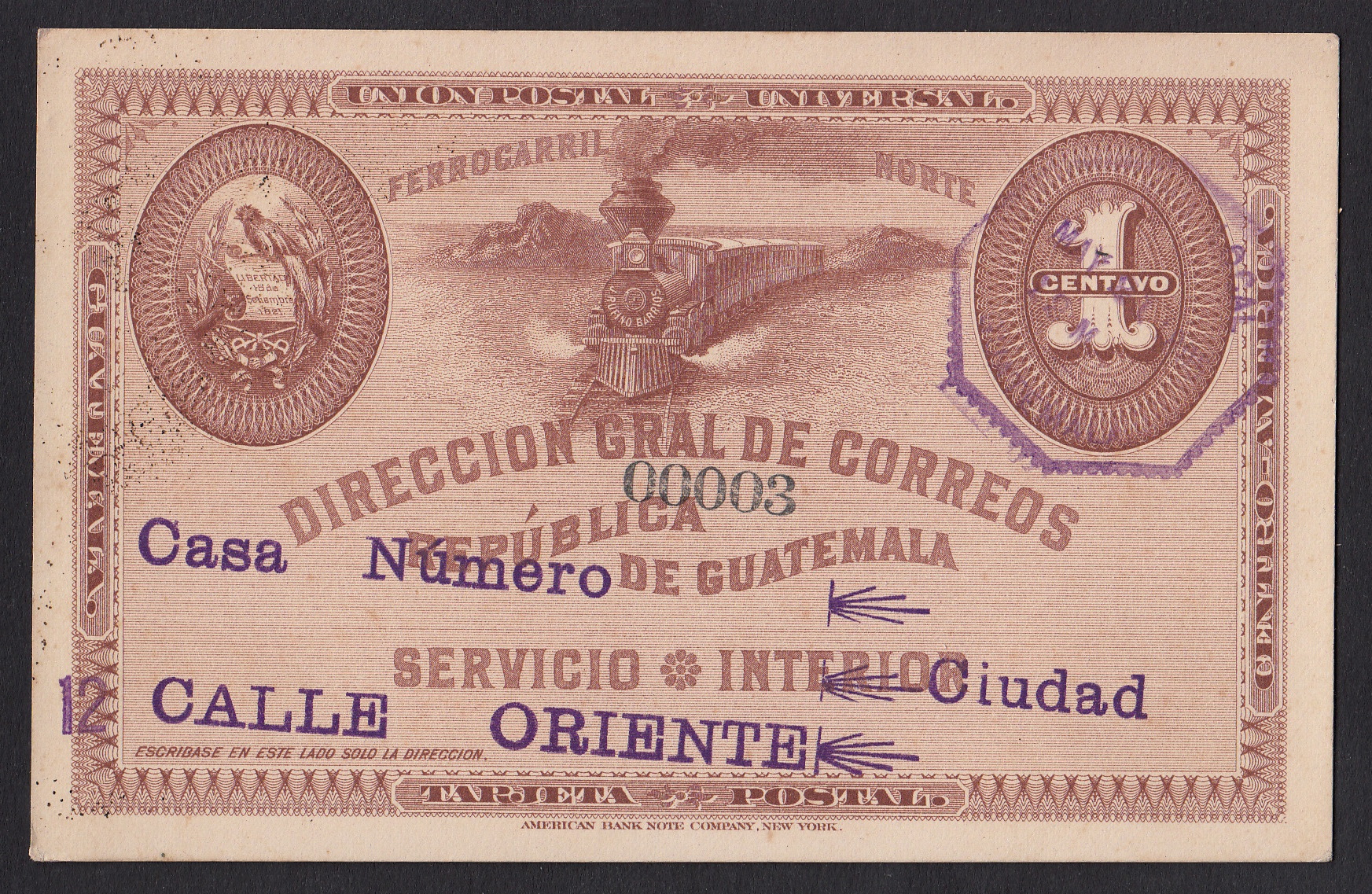 > Fast möchte man ein wenig zurücktreten ob des herannahenden Zuges, der direkt auf den Betrachter dieser Postkarte zufährt. Gerade die mittelamerikanischen Staaten hatten vor 1900 sehr elegant und künstlerisch gestaltete Briefmarken und Ganzsachen - wie etwa diese hier aus Guatemala aus dem Jahr 1895, die als Inlandsdrucksache eines Händlers lief. Geliefert wurden sie von dem berühmt-berüchtigten Nicolas F. Seebeck, der sie in New York fertigen ließ und sie dann vielen Ländern Mittelamerikas kostenfrei überließ. Sein Ziel: Er schuf jedes Jahr neue Ausgaben und hatte das Recht, "seine" Briefmarken und Ganzsachen an die Sammler zu verkaufen. Es war ein einträgliches Geschäft. Die beeindruckend schöne Gestaltung der Stücke war bestimmt ein Punkt, um den Verkauf an die Philatelisten in aller Welt zu fördern.