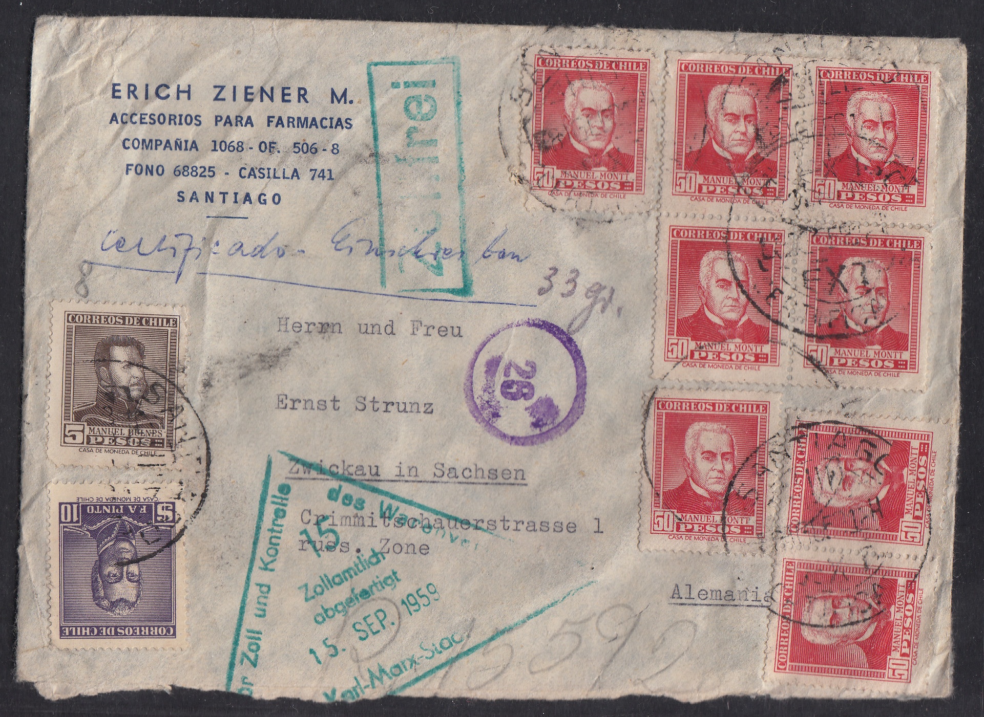 > Am 18. August 1959 schickte ein offenbar deutschstämmiger Apotheker aus Santiago in Chile einer Familie in Zwickau in der damaligen DDR einen mit 33 Gramm recht schwergewichtigen eingeschriebenen Brief. Waren vielleicht Tabletten darin? Wer weiß. Jedenfalls prüfte der DDR-Zoll die Sendung, ließ sie aber dann aber doch ohne Gebühren passieren. Familie Strunz in Sachsen dürfte darüber froh gewesen sein.