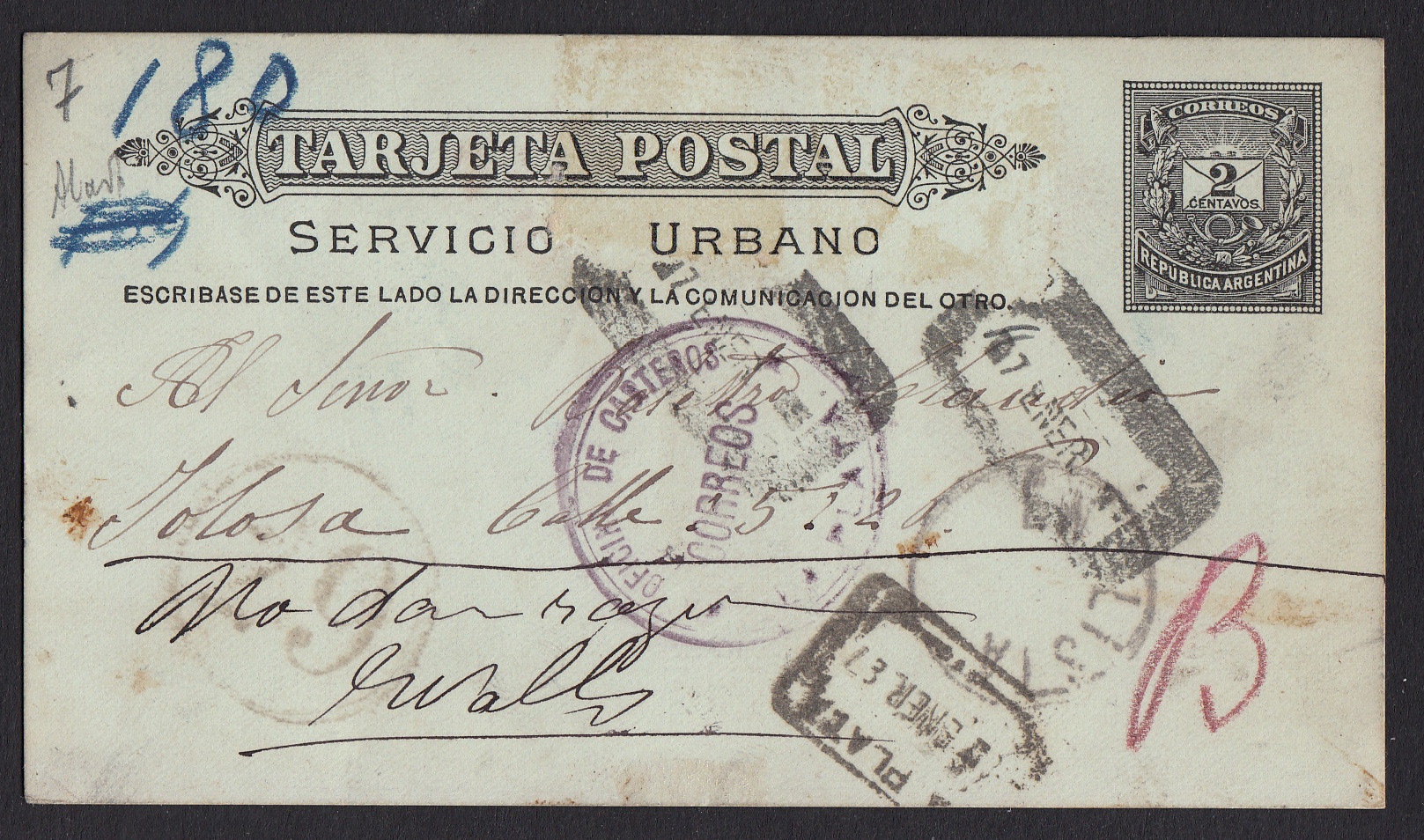 > Auch in Argentinien gab es, wie in vielen anderen Ländern auch, ein ermäßigtes Ortsporto. Die Post hielt dafür spezielle Ganzsachen bereit - wie etwa dieses Exemplar hier. Diese Karte lief 1887 innerhalb der Hauptstadt Buenos Aires. Die Zahl der Stempel, auch auf der Rückseite befindet sich noch einer, zeigt, dass sich die Beamten für zwei Centavos sehr viel Arbeit gemacht haben.