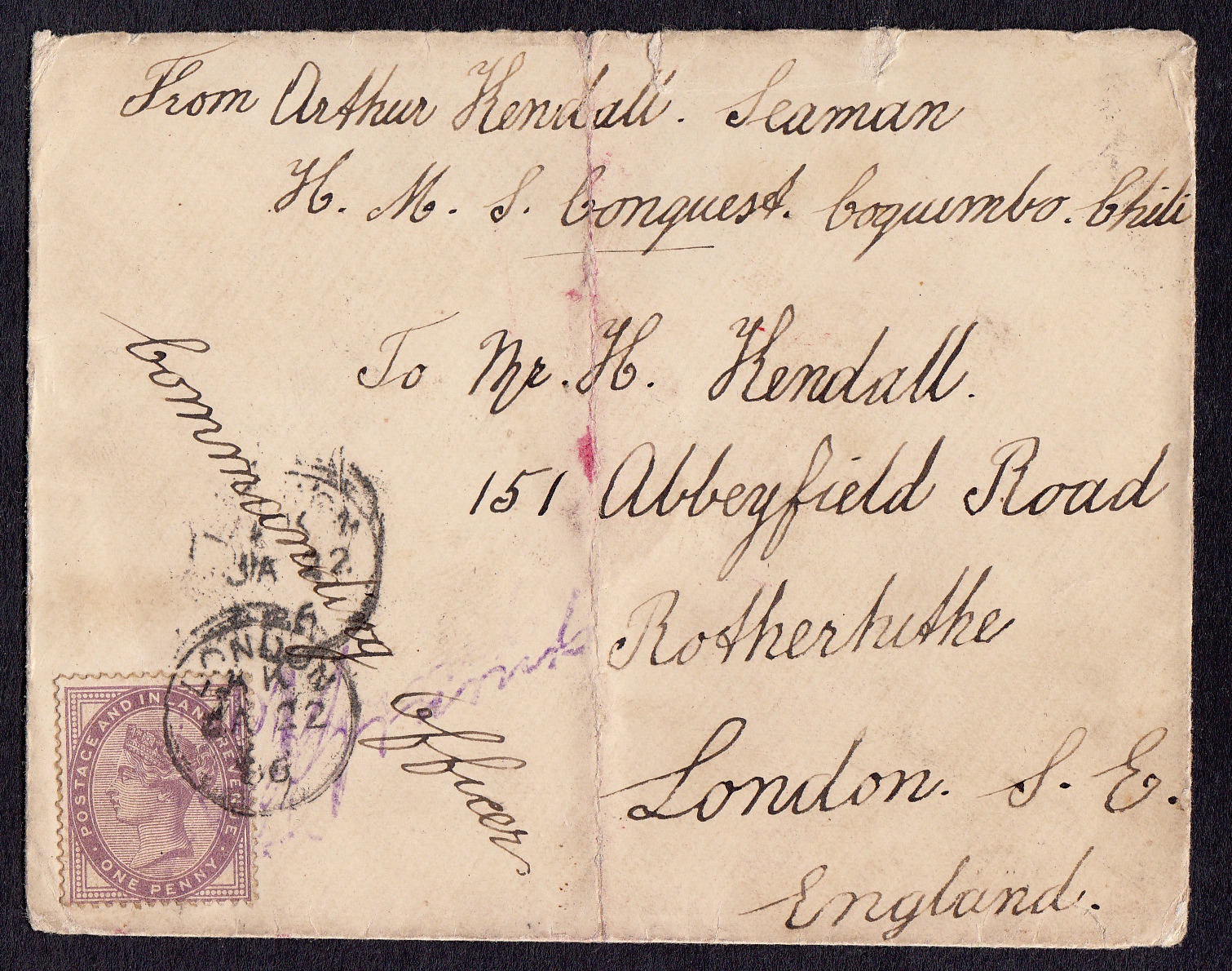 > Im Herbst 1885 lag das britische Kriegsschiff "HMS Conquest" (Bild) im Hafen der Stadt Coquimbo in Chile, und der Seemann Arthur Kendall wollte seiner Familie daheim im Londoner Stadtteil Rotherhithe ein Lebenszeichen geben von seiner sicher sehr langen Seereise. Die britische Admiralität hatte dafür mit der Postverwaltung einen speziellen Portosatz ausgehandelt: Egal von wo der Brief aufgegeben wurde, einfache Seeleute zahlten immer nur den britischen Inlandstarif von einem Penny. Schließlich war deren Heuer nicht eben hoch und teure Auslandstarife, zumal vor der Gründung des Weltpostvereins, hätten sich viele Seeleute nicht leisten können. Der Brief wurde mit einem Penny freigemacht, der Kommandant des Schiffes bescheinigte per Unterschrift unten links, dass der Absender berechtigt war, das verbilligte Porto in Anspruch zu nehmen und das Londoner Hauptpostamt prüfte den Brief und entwertete die Marke. Am 22. Januar 1886 kam der Brief dann in der Abbeyfield Road an. Man wird dort darauf gewartet haben.