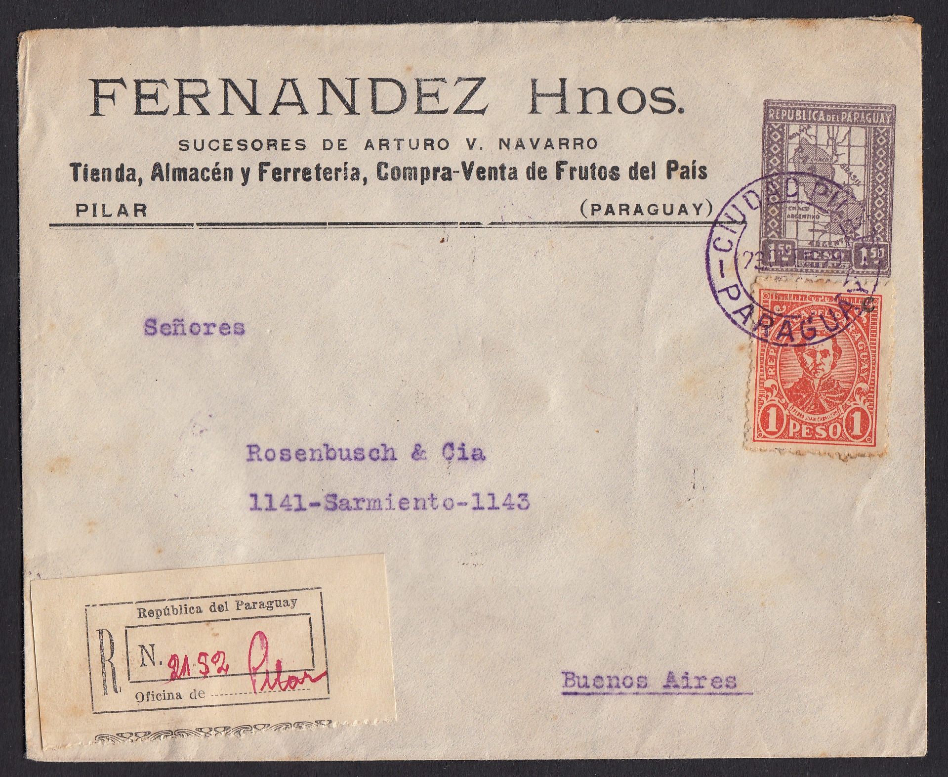 > Baumärkte sind heutzutage weithin bekannt; wer Haus und Garten hat, schätzt die Vielfalt des Sortiments. Weniger bekannt ist wohl, dass es sie früher auch schon gab - selbst in Paraguay. Das Geschäft Fernandez in der Stadt Pilar jedenfalls firmiert auf diesem Briefumschlag als Baumarkt und allgemein als Laden. Man konnte wohl alles mögliche dort erwerben. Kurios aus heutiger Sicht ist, dass Senor Fernandez auch Obst an- und verkaufte. Das würden Obi, Hornbach und andere heute ablehnen. Das Unternehmen in Pilar muss einen ansehnlichen Umsatz gemacht haben, denn es hatte sich Privatganzsachen drucken lassen, um die Geschäftspost rationeller abwickeln zu können. Dieser Brief ging per Einschreiben am 23. Oktober 1929 nach Buenos Aires / Argentinien. Der Obsthandel wird wohl nicht das Thema des Schreibens gewesen sein; dafür war der Weg zwischen den beiden Städten sicher etwas zu weit.
