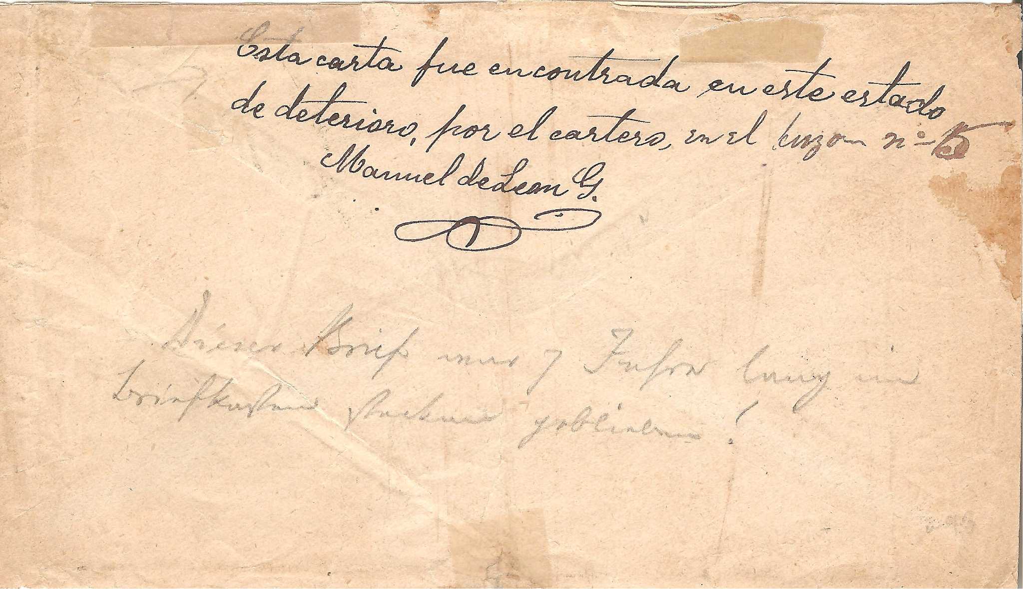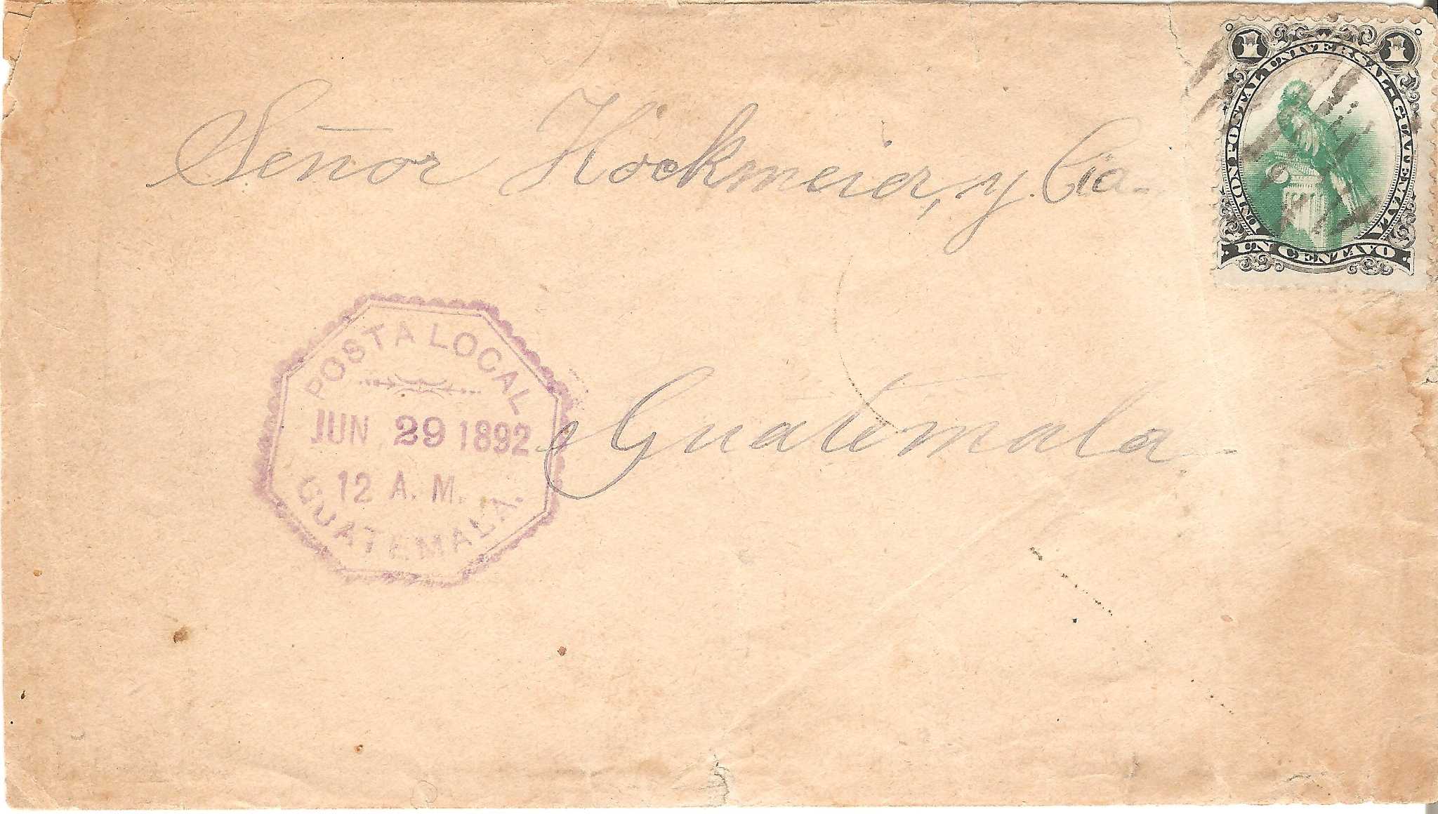 > Irgendwann im Jahr 1885 warf jemand diesen Ortsbrief in Guatemalas Hauptstadt Guatemala-Stadt in einen Briefkasten. Wir wissen nicht, ob sich etwas wichtiges in dem Umschlag befunden hat, doch bei der Firma Hockmeier hat man vergeblich auf die Zustellung gewartet. Der mit einer Marke zu einem Centavo der Ausgabe Quetzal des Jahres 1885 frankierte Umschlag blieb nämlich sieben (!) Jahre im Briefkasten liegen, bevor ihn ein Beamter entdeckte, am 22. Juni 1892 abstempelte und zustellte. Auf der Rückseite wurde das peinliche Malheur von Manuel de Leon, sicher ein Postbediensteter, mit Tinte korrekt vermerkt: "Dieser Brief wurde in diesem schlechten Zustand vom Postboten im Briefkasten Nr 15 gefunden." Klar, bei den tropischen Temperaturen in Guatemala konnte er nicht mehr frisch aussehen. In der Firma Hockmeier dürfte man sich über diese späte Post sicher gewundert haben. Nebenbei ist so auch die späteste Verwendung dieser Ausgabe entstanden.
