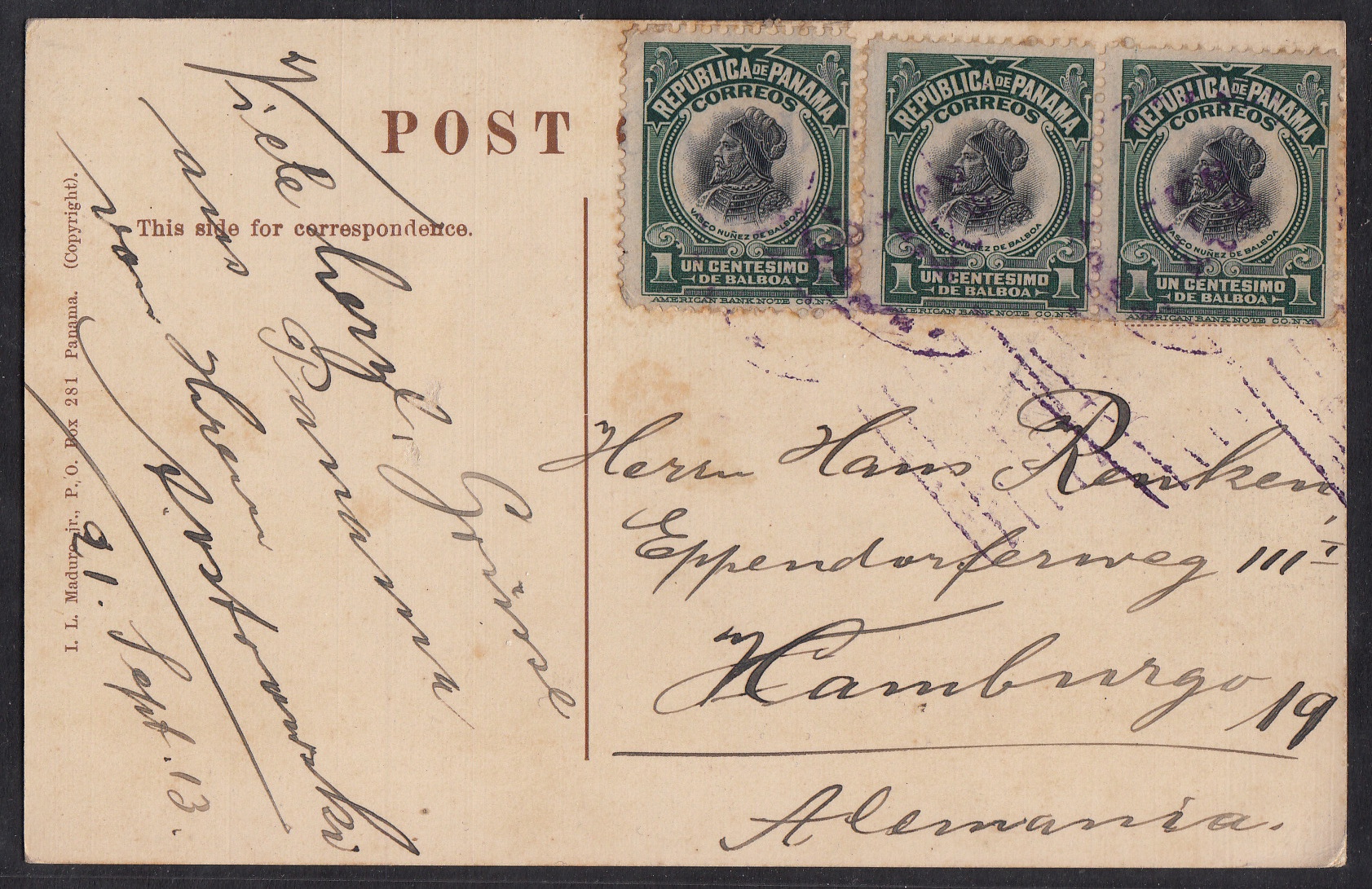 > Im September 1913 reiste ein Deutscher, vermutlich ein Seemann, um die Welt. Auch in Panama, dem Land mit dem berühmten Kanal, ging er an Land und schickte von dort eine Postkarte mit einem kurzen Gruß und einer schönen Mehrfachfrankatur nach Hamburg. Der Empfänger hätte sicherlich gern etwas mehr aus Panama erfahren, aber vielleicht ging es ihm auch nur um die Briefmarken.