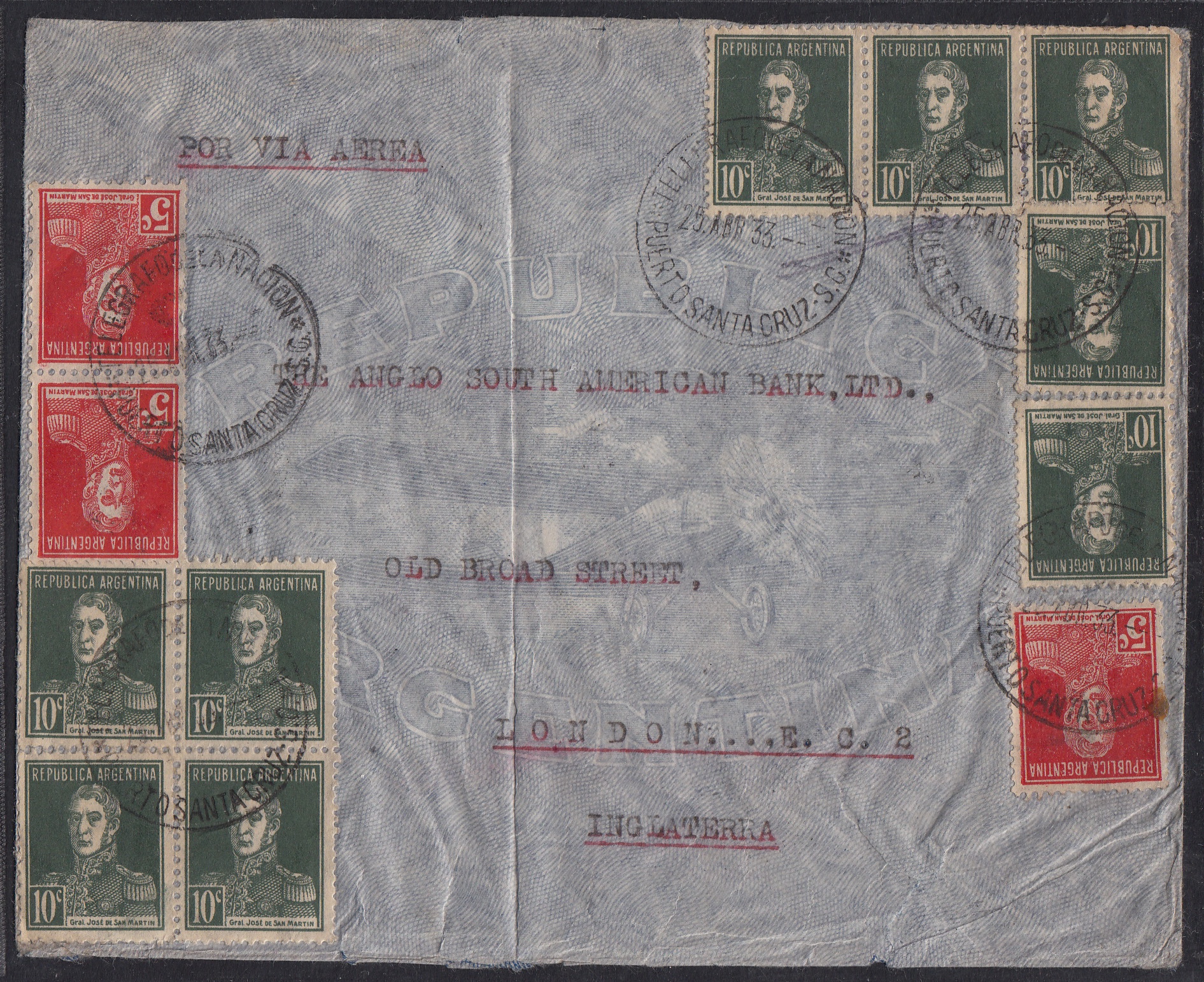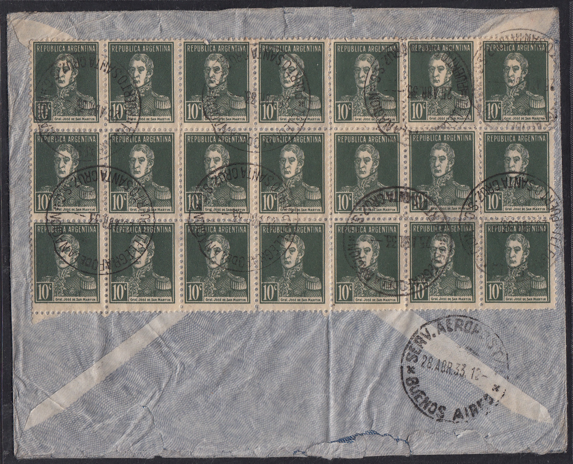 > Luftpostbriefe nach Übersee waren in den 1930er-Jahren noch recht kostspielig. Auch dieser Brief hier aus Argentinien von 1933 kostete immerhin 3,15 Pesos - ein hohes Porto für diese Zeit, hätte der gewöhnliche Brief doch nur für 12 Centavos verschickt werden können. In dem kleinen Ort Puerto Santa Cruz war man vermutlich auf hohe Porti im Peso-Bereich nicht eingerichtet, und so musste der Postbeamte immerhin u. a. 30 Marken im Wert von 10 Centavos verkleben, um den Brief nach Großbritannien zu frankieren. Optisch sieht es nach einer Inflationsfrankatur aus. Das ist sie aber nicht, denn der argentinische Peso war damals sehr wertstabil, und das südamerikanische Land zählte zu den zehn reichsten Ländern der Welt.
