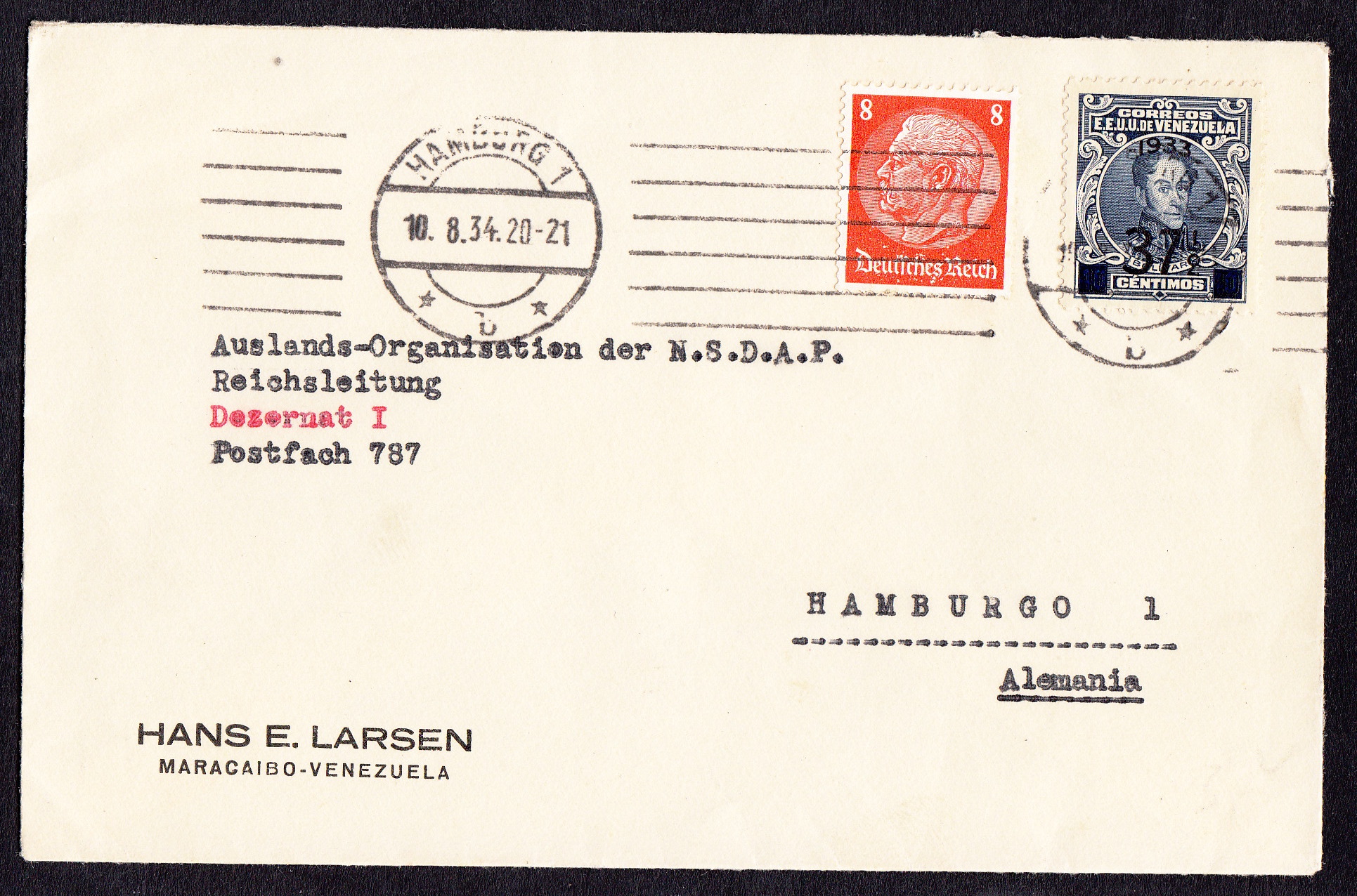 > Der Nationalsozialismus und das vom ihm begründete "Dritte Reich" sind mit ihren monströsen Vebrechen das dunkelste Kapitel der deutschen Geschichte. Doch nicht nur in Deutschland, auch im Ausland gab es Unterstützer für die braunen Machthaber - selbst in Überseee. Ein Hans E. Larsen, wohl ein deutschstämmiger Auswanderer, richtete jedenfalls 1934 aus Maracaibo in Venezuela einen Brief an die Auslandsorganisation der NSDAP in Hamburg. Er frankierte den Brief korrekt mit einer Überdruckmarke zu 37,5 Centimos für das Auslandsporto, doch danach hatte er offenbar Bedenken, den Brief über die venezuelanische Post abzuschicken. Fürchtete er, man könnte den Brief angesichts des Adressaten öffnen und der Inhalt ihn dann kompromittieren? Jedenfalls übergab er den Brief offenbar einem privaten Boten, vermutlich einem deutschen Seemann in der Hafenstadt Maracaibo. Dieser gab ihn dann bei seiner Ankunft in Hamburg beim dortigen Hauptpostamt am 10. August 1934 auf und frankierte ihn korrekt mit dem Ortsporto zu 8 Pfennig. Wer war Hans E. Larsen? Er hat sich vermutlich nicht nur durch Briefe den Nazis angedient, denn am 17. Juli 1941 taucht er auf der amerikanischen Liste feindlicher Personen "The Proclaimed List of Certain Bloked Nationals" in Washington auf; ebenso auf einer "Black List" Großbritanniens. Die US-Liste umfasst immerhin 1835 Personen und Firmen in Lateinamerika, die Washington als feindlich einstufte. Die meisten stammten aus Argentinien (289) und Brasilien (265); Venezuela (60) nimmt eher einen hinteren Platz ein. Was Hans E. Larsen gemacht hat, ist dem Internet nicht zu entnehmen, auch über sein späteres Leben kann man nur etwas vermuten. Nach dem Zweiten Weltkrieg begann sehr rasch der Kalte Krieg, der mit dem Beginn des Korea-Krieges 1950 im Westen in eine antikommunistische Hysterie einmündete. In den USA waren das die Jahre der McCarthy-Ära, die "Schwarzen Listen" des Zweiten Weltkriegs waren vergessen. Möglicherweise konnte Larsen das für sich nutzen und in die USA einwandern. Eine Lokalzeitung an der Ostküste der Vereinigten Staaten vermeldete 1953, das ein Hans E. Larsen seine Tochter glücklich verheiraten konnte. Es ist also nicht ausgeschlossen, dass der Altnazi Larsen später als unauffälliger Bürger lebte - wie so viele andere Altnazis in Deutschland auch.