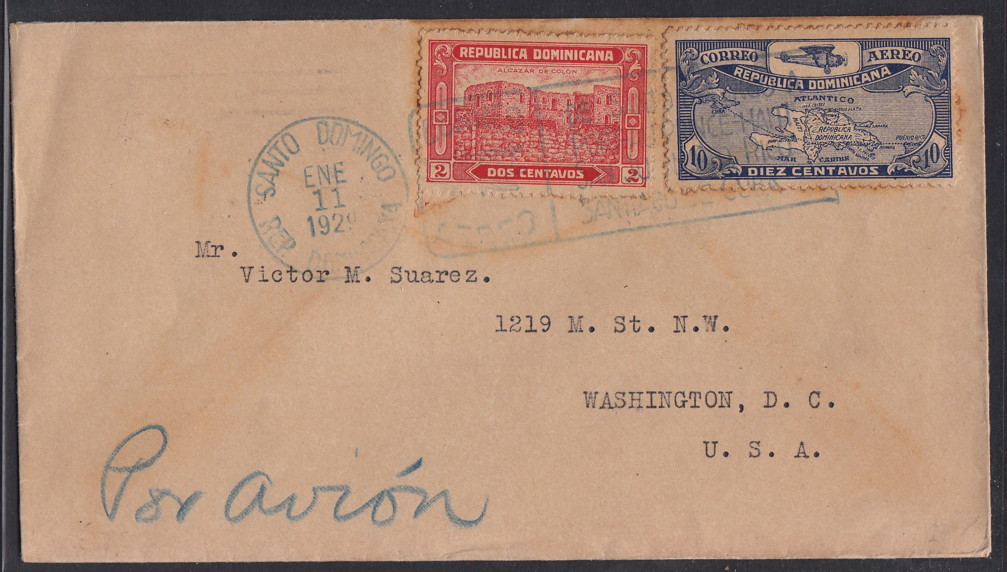 > Flugpost aus den 1920er Jahren ist oft nicht häufig anzutreffen. Die Technik der Fluggeräte war noch niedrig; Flüge über große Distanzen kaum möglich. Dennoch gab es damals schon Briefe, die auch über größere Distanzen per Luftpost befördert wurden - wie etwa diesen Brief hier aus der Dominikanischen Republik vom 11. Januar 1929. Er ging nach Washington und trägt rückseitig einen Luftpost-Durchgangsstempel aus Miami vom 12. Januar und war vermutlich am nächsten Tag in der US-Hauptstadt. Ob das die Post heute auch noch schafft?